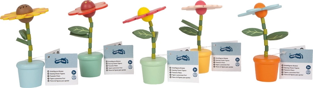 Armas tantsiv puulill lillepotis rõõmustab nii lapsi kui ka täiskasvanuid. Põhja surumisel hakkab lill õrnalt liikuma – varred lainetavad ja õis õõtsub. See lihtne, kuid köitev mänguasi arendab peenmotoorikat, koordinatsiooni ja liikumistaju. Tänu vastupidavale puidule, siledale pinnale ja kompaktsele suurusele püsib see hästi väikestes kätes. Hind on 1 tk eest, saadaval on 5 värvivarianti, saadame juhuslikult.