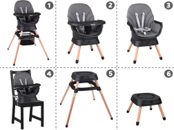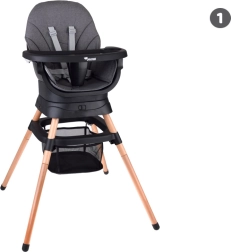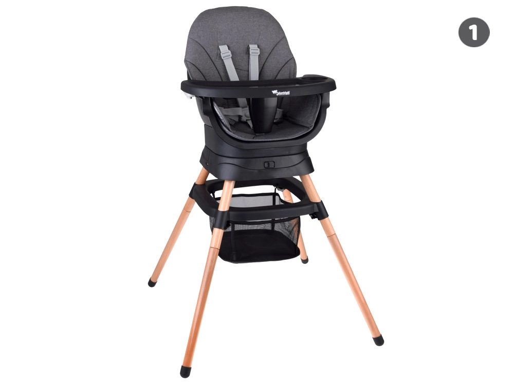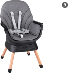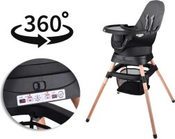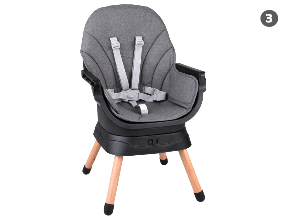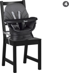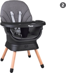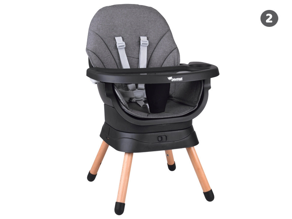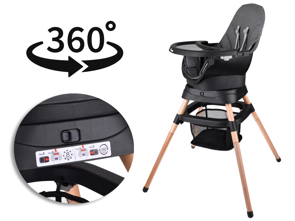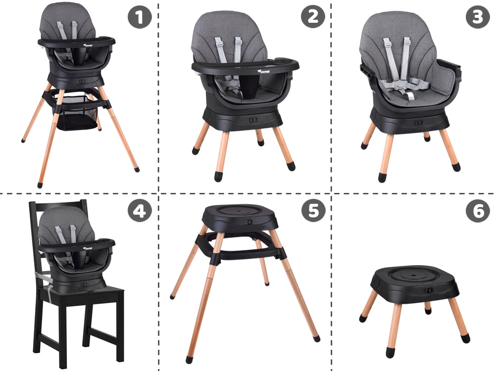 Multifunktsionaalne 6-ühes tool ühendab mugavuse, ohutuse ja praktilisuse ühes lahenduses. Tänu läbimõeldud modulaarsele ehitusele saab selle hõlpsalt muuta kõrgeks söögitooliks, madalaks tooliks kandikuga, eraldiseisvaks tugitooliks, söögitooli pealise jaoks, kõrgeks taburetikuks või madalaks järiks. 360° pöörlev iste 8 lukustusasendiga tagab ideaalse seadistuse nii söötmiseks kui ka mängimiseks.