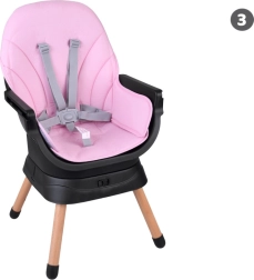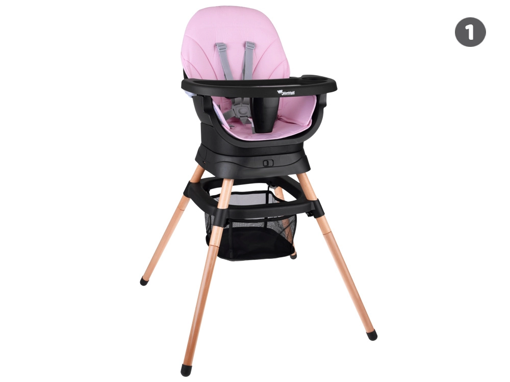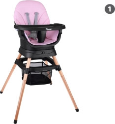 Modulaarne süsteem võimaldab kiiret ümberseadistamist ilma tööriistadeta: kõrge söögitool, madal tool kandikuga, eraldiseisev tugitoolike, kinnitustega söögitooli pealisosa, kõrge taburet ja madal taburett. Tooli allosa täiendavad praktiline korv väiksemate esemete jaoks.