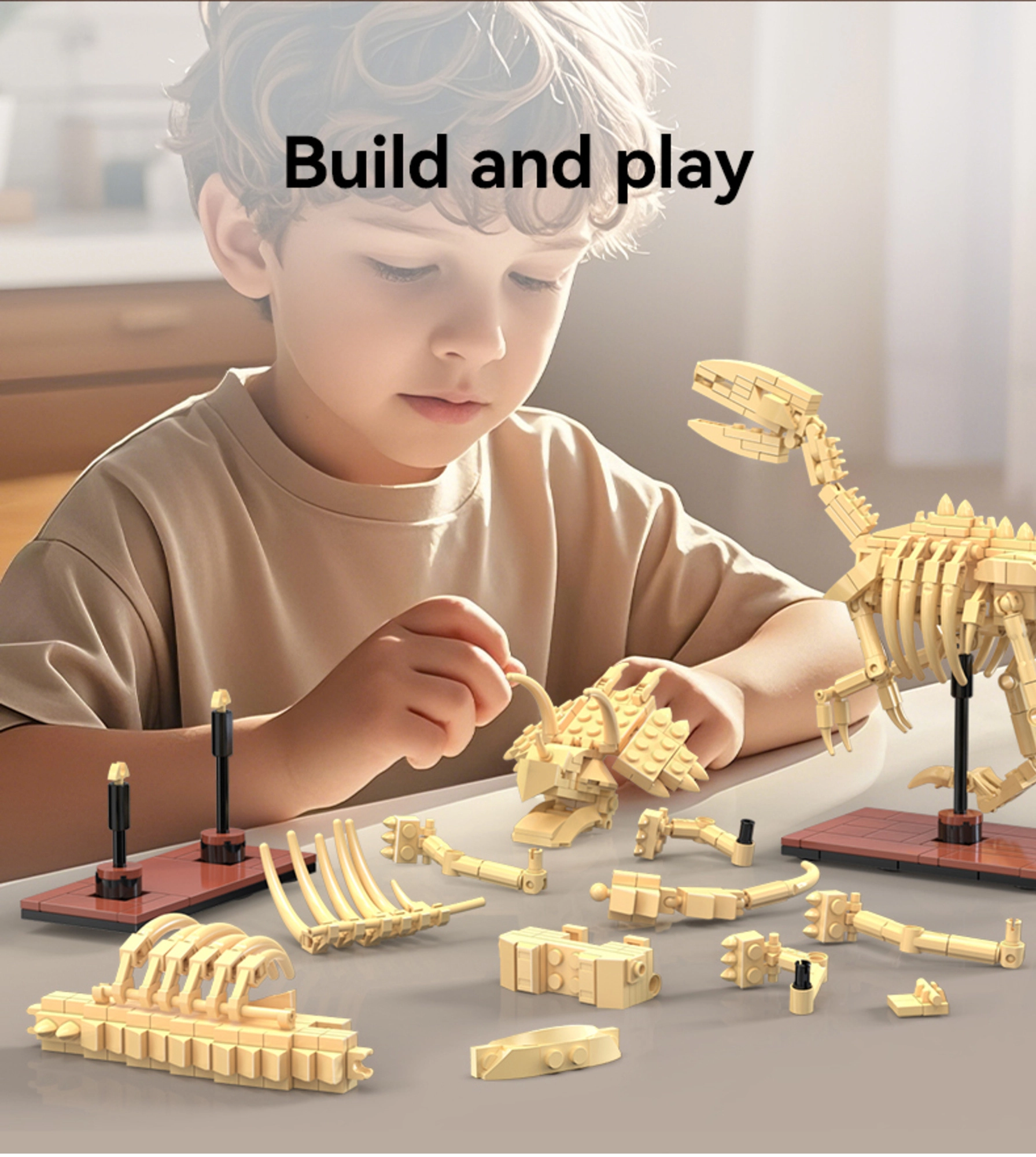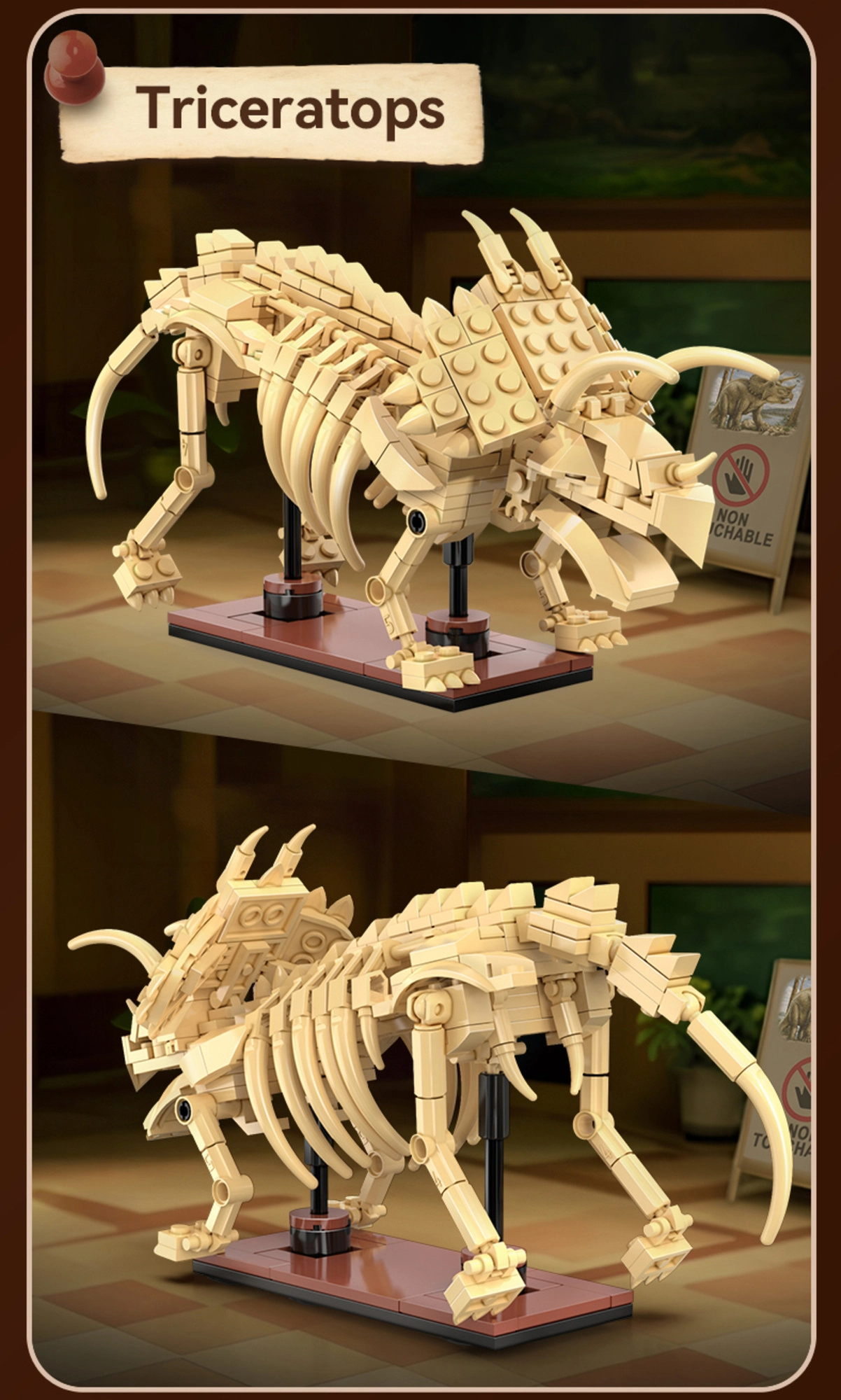 Tänu liikuvatele kaela-, jäsemete- ja sabaliigenditele saad poose hõlpsalt muuta. Modulaarne konstruktsioon võimaldab ühendada teiste sama seeria komplektidega ja kollektsiooni laiendada. Kõik pannakse kokku intuitiivselt – ilma liimi ja tööriistadeta, tugevate ühendustega, mis on ühilduvad teiste ehituskomplektidega.