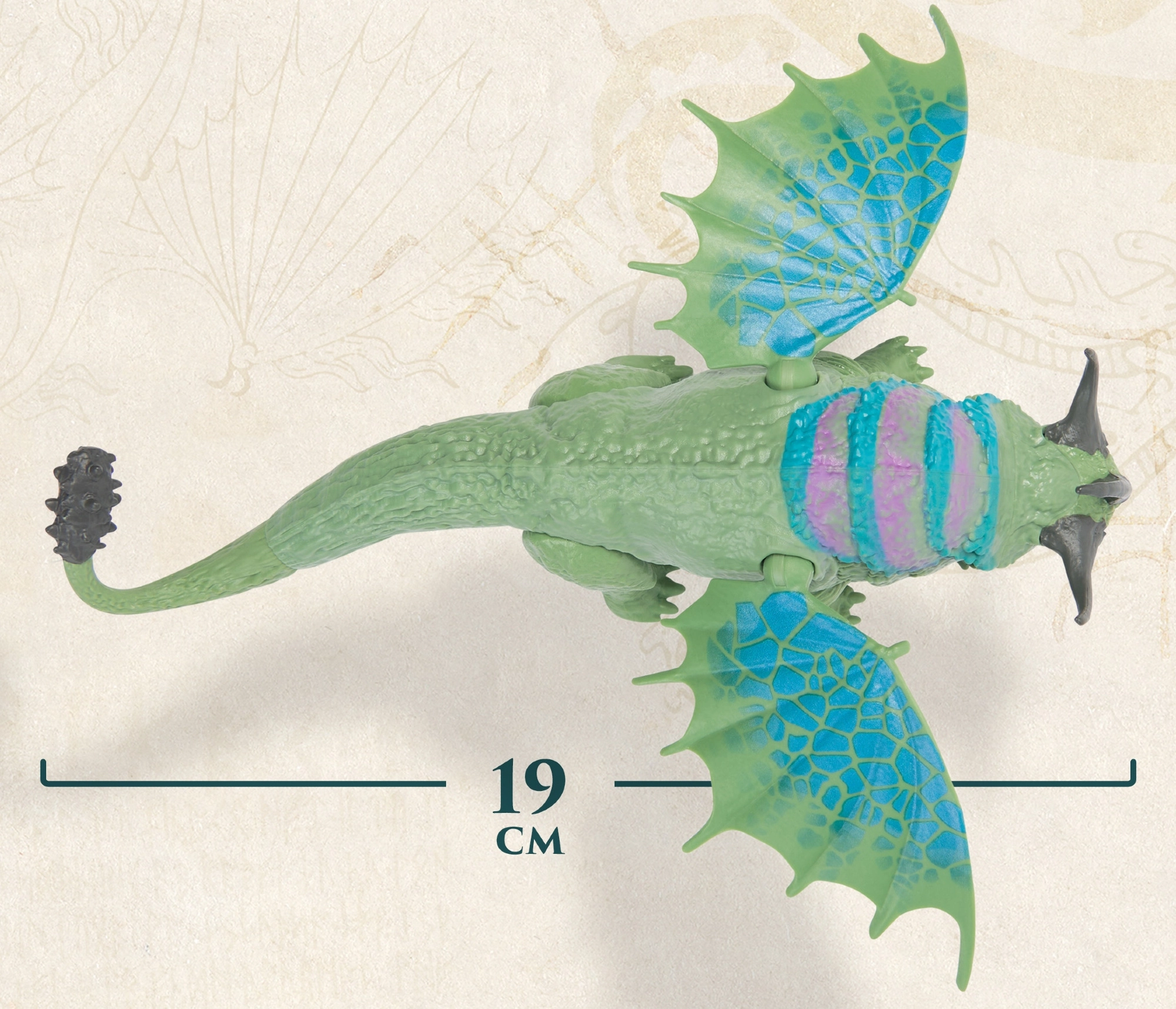 Rumblehorni figuur püüab pilku massiivse keha, silmatorkavate sarvede ja suurte ainulaadse mustriga tiibadega. Inspireeritud DREAMWORKS Dragonsi filmimaailmast, jäädvustab see truult armastatud lohe välimuse. Liikuvad liigesed võimaldavad dünaamilisi poose – alates tõusust Berk’i kohale kuni lahinguvalmiduseni.