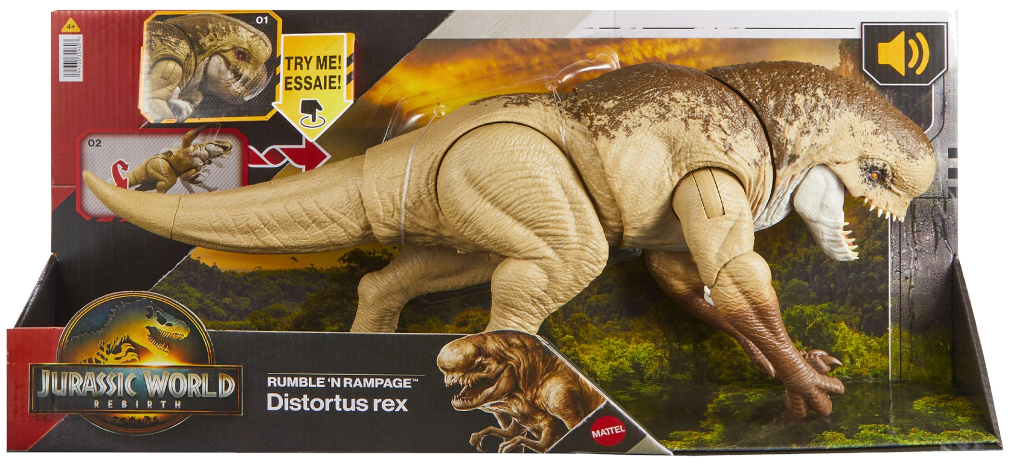 Valmistu eepilisteks lahinguteks realistliku umbes 50 cm kõrguse Distortus Rexi figuuriga sarjast JURASSIC WORLD Odrodzenie brändilt Mattel. Dinosaurus pakub nupuvajutusega hirmutavat möirget, hammustust koos esijäsemete liikumisega ja sabal juhitavat külglööki. Tänu detailsele naha tekstuurile, suurele liikuvusele ja AR‑koostoimele rakenduses on see ideaalne kingitus väikestele seiklejatele ja dinosaurusefännidele.