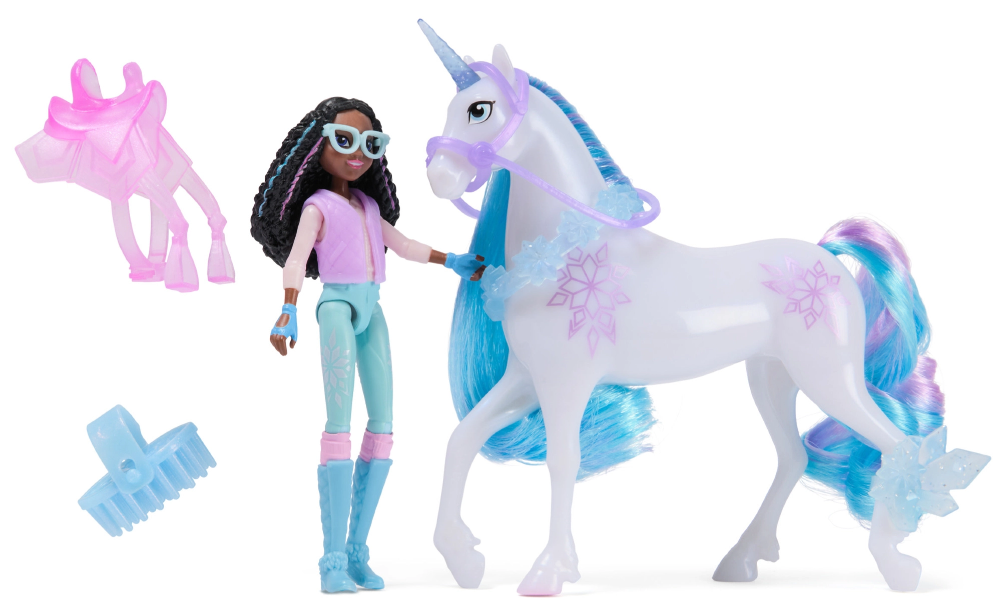 Avastage Sparkle Lake’i maailma võlu komplektiga, mis on inspireeritud populaarsest sarjast UNICORN ACADEMY. Layla värvilises rõivastuses ja ükssarvik Glacier sinakas‑lilla lakaga pakuvad lastele tunde fantaasiamängu. Tänu liigendatud jäsemetele saab Layla kergesti sadulasse istuda ja luua dünaamilisi poose.