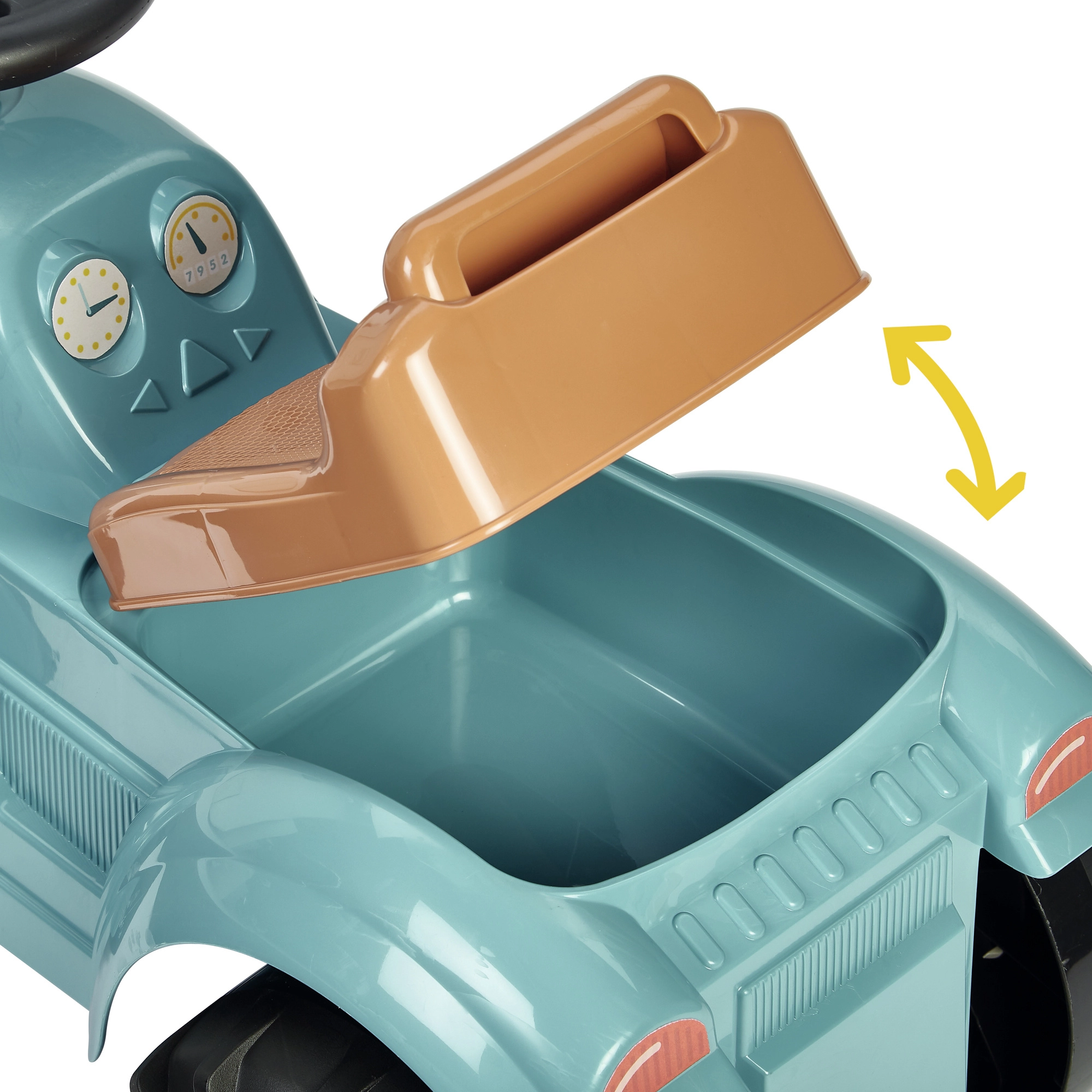 Ülesklapitava istme all asub ruumikas peidukoht lemmikvidinate jaoks. Lapsed tõukavad end edasi jalgadega, mis tugevdab loomulikult lihaseid ja arendab koordinatsiooni, ning rool võimaldab lihtsat suunajuhtimist.