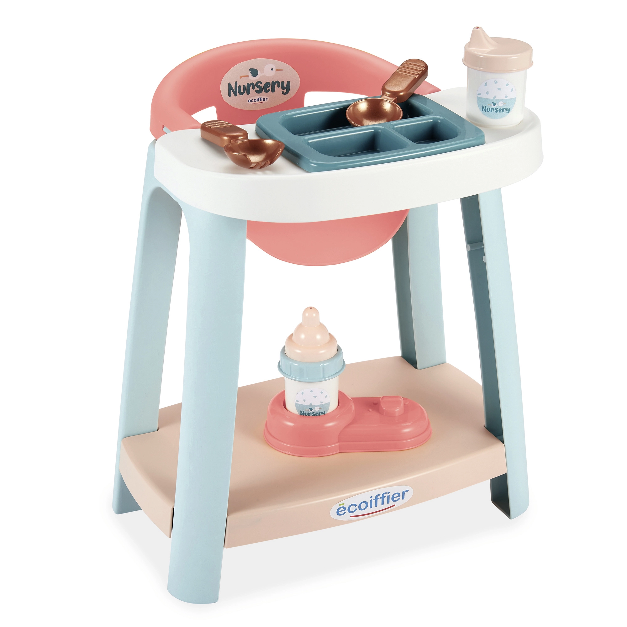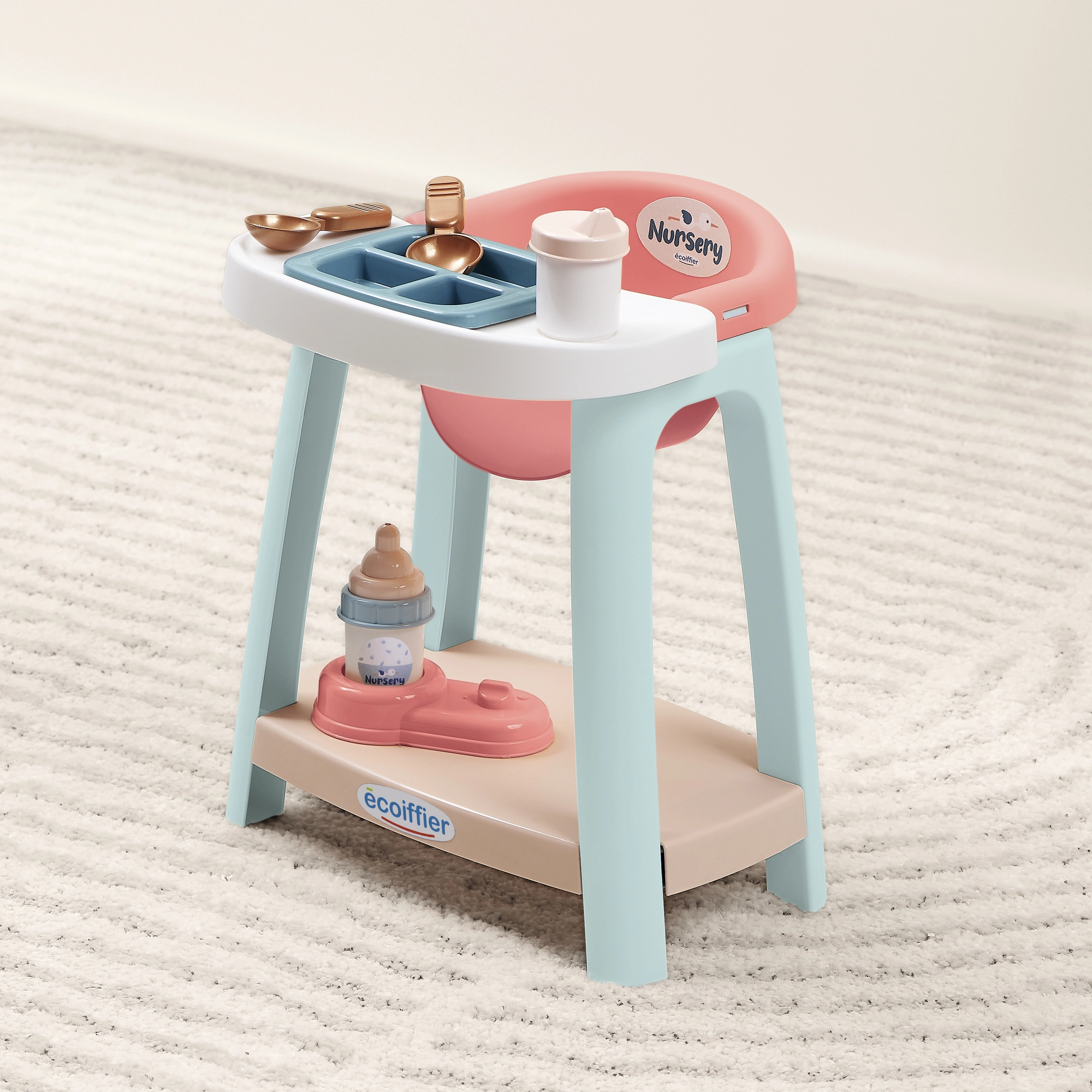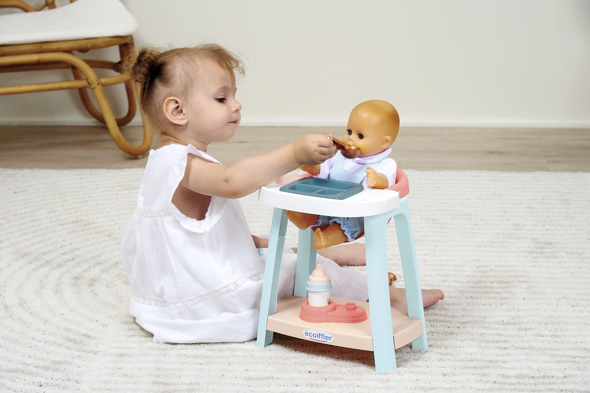 Stabiilne kõrge tool koos kandikuga võimaldab lastel nukku mugavalt „toita” ja matkida päris söögirituaale.