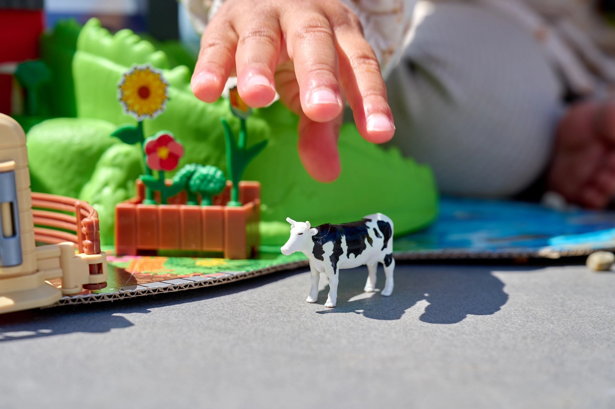 Ehitage ja mängige kahel tasandil: all hoiustage sõidukeid, üleval on loomad ja hein. Ramped ja väravad lisavad mänguvõimalusi ning toetavad kujutlusvõimet.
