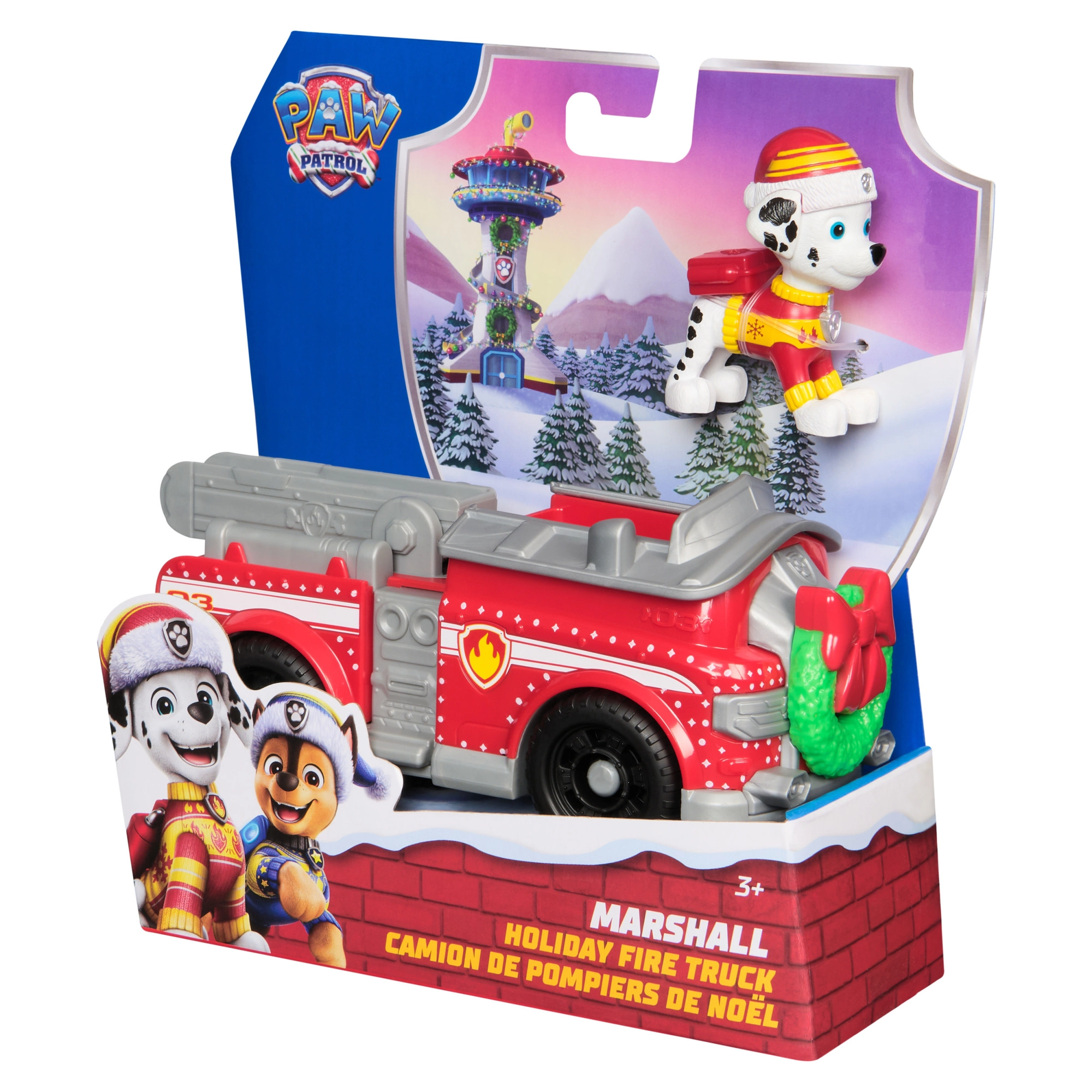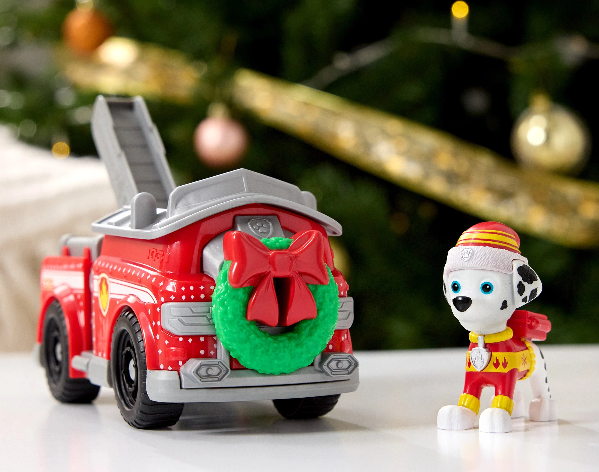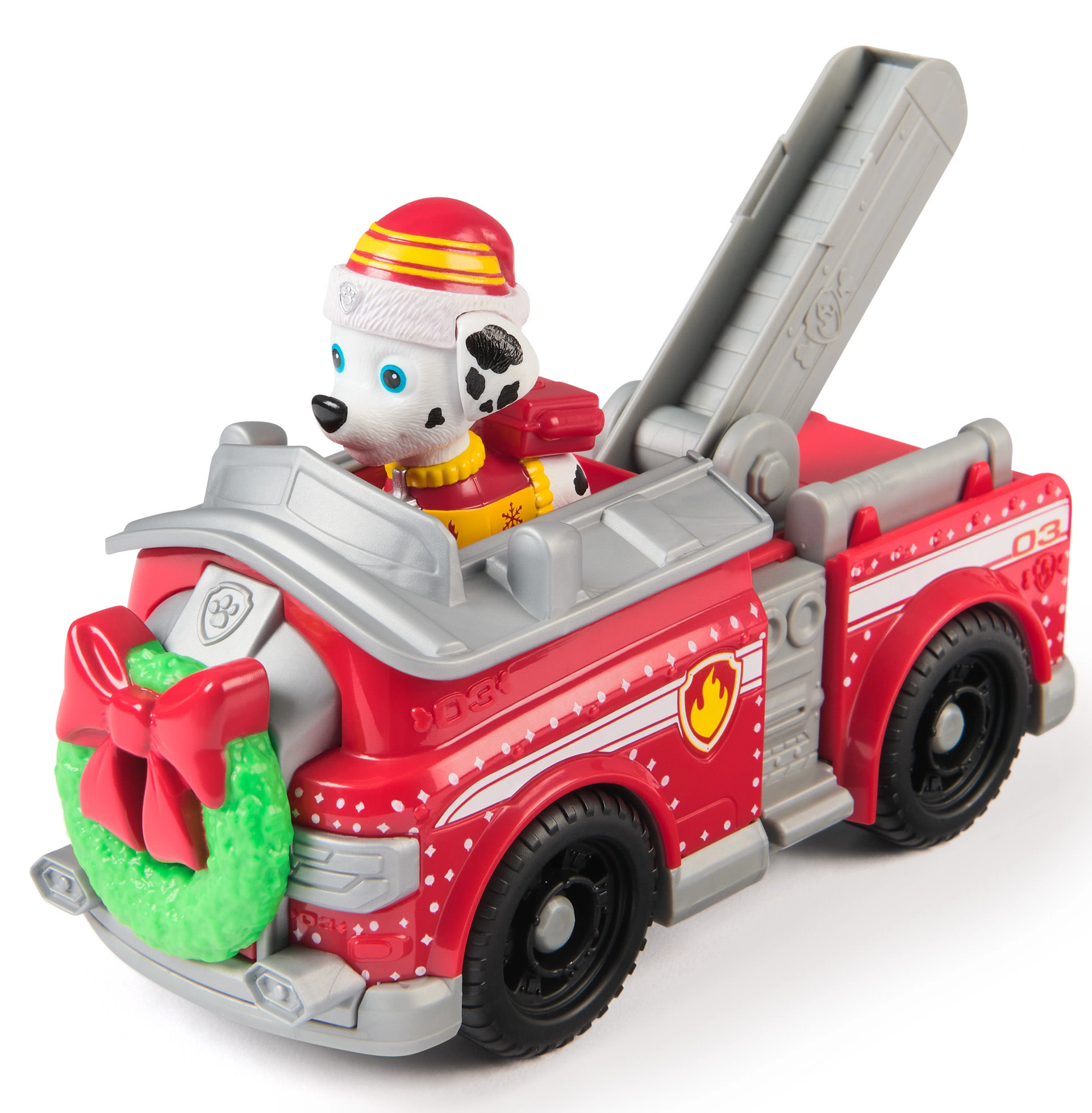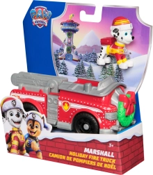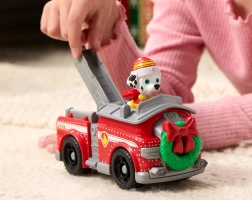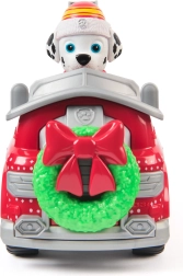 Punast tuletõrjeautot kaunistab roheline pärg lindiga ja talvised motiivid. Sooja mütsiga Marshall valmistab iga missiooni talveks ette.
