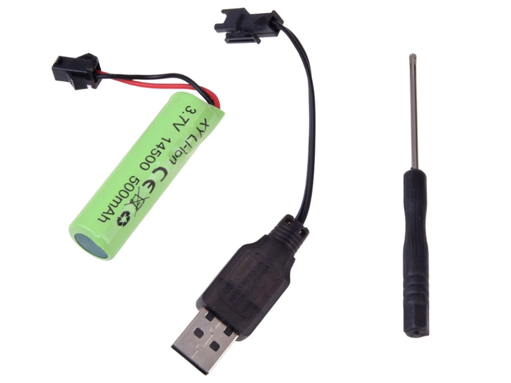 Komplektis on Li-ion aku 14500 3,7 V ja USB-kaabel mugavaks laadimiseks. Esmane laadimine kestab umbes 1 tund.