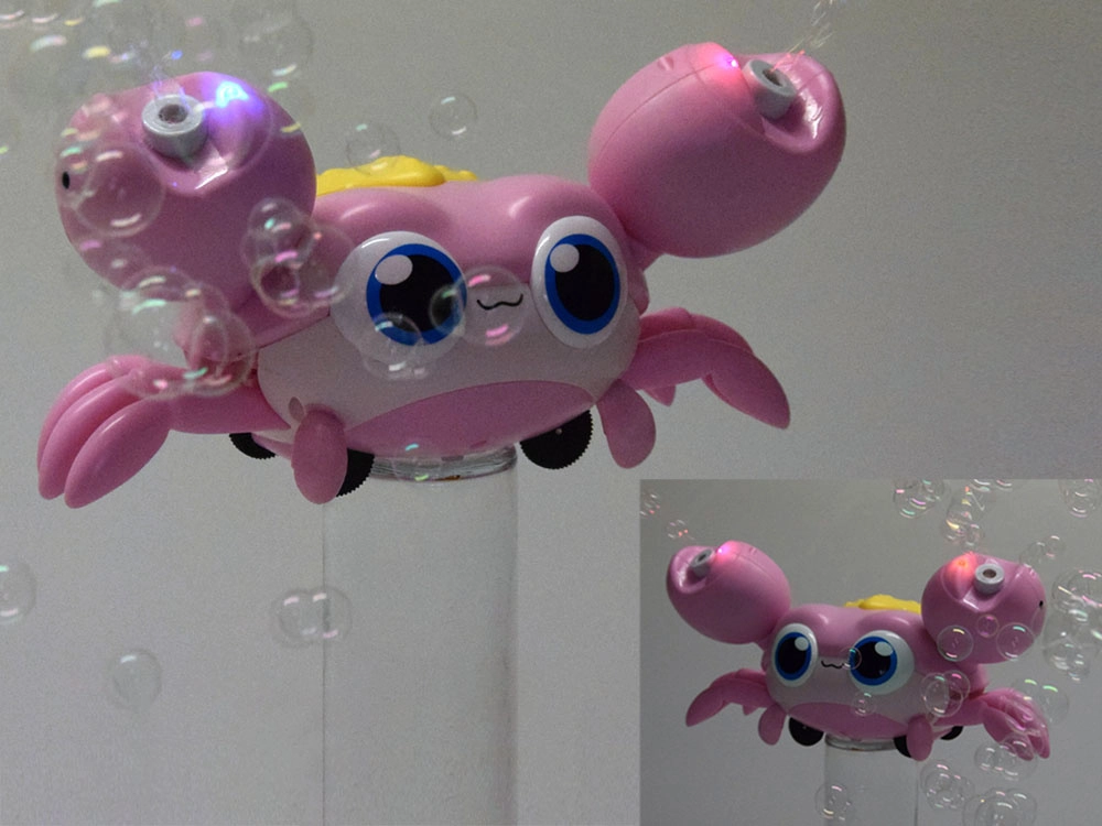 Pane lõbu käima liikuva krabiga, mis sõidu ajal puhub rikkaliku hulga mulle. Laetava aku ja lihtsa lahuse lisamisega naudivad lapsed pikki rõõmutunde – nii toas kui õues. Vastupidav teostus ja armas disain koos valgustuvate detailidega saavad kiiresti iga lapsepeo lemmikuks.