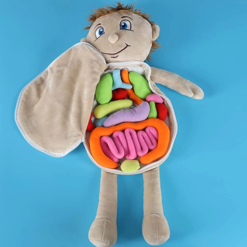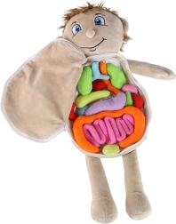 See õppeotstarbeline plüüšnukk avaneva kõhuga aitab lastel mõista inimese anatoomia põhialuseid mängulisel ja käegakatsutaval moel. Kõht avaneb hõlpsalt turvalise luku abil ning paljastab värvilised, pehmed organid, mis on kinnitatud takjakinnitusega lihtsaks eemaldamiseks ja tagasi asetamiseks. Nukk on valmistatud mõnusast polüestrist ja sellel on kergesti eemaldatav riietus, mis seotakse selja tagant.