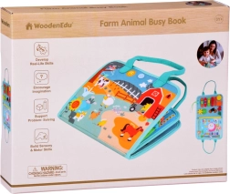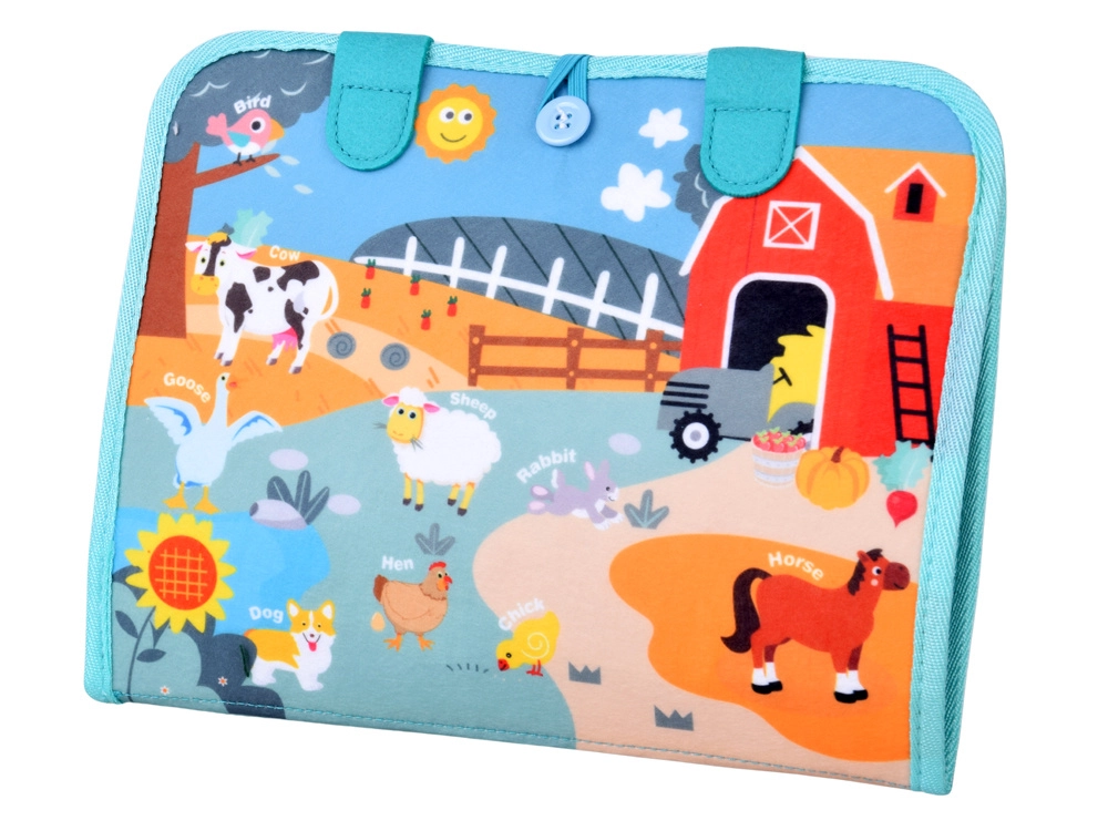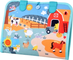 Iga leht pakub eri tüüpi tegevust: alates riietamisest ja käeharjutustest, puslede kokkupanekust ja numbrite õppimisest kuni kalendri, ilma ja ajani. Komplektis on ka numbrid ja matemaatikatehete märgid esimesteks ülesanneteks. Värvilised talu- ja loomapildid köidavad tähelepanu ja toetavad värvide ja kujundite eristamist.