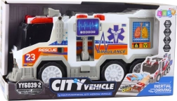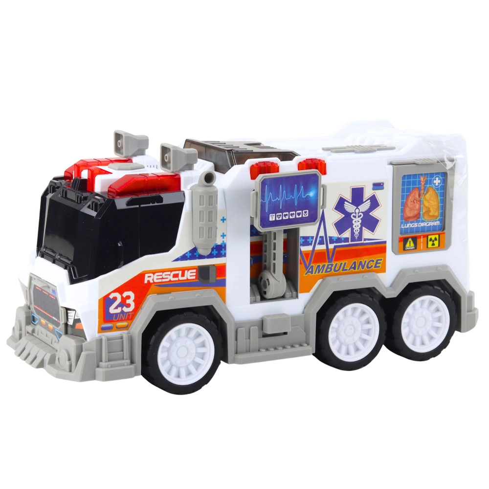 See detailirohke kiirabi köidab lapsi populaarses valge-punases värvikombinatsioonis siniste elementide ja silmapaistvate meditsiiniliste tähistustega. Nuppude vajutamisel aktiveeruvad sireenid ja valgusefektid, mis lisavad päästestseenidele ehtsust.