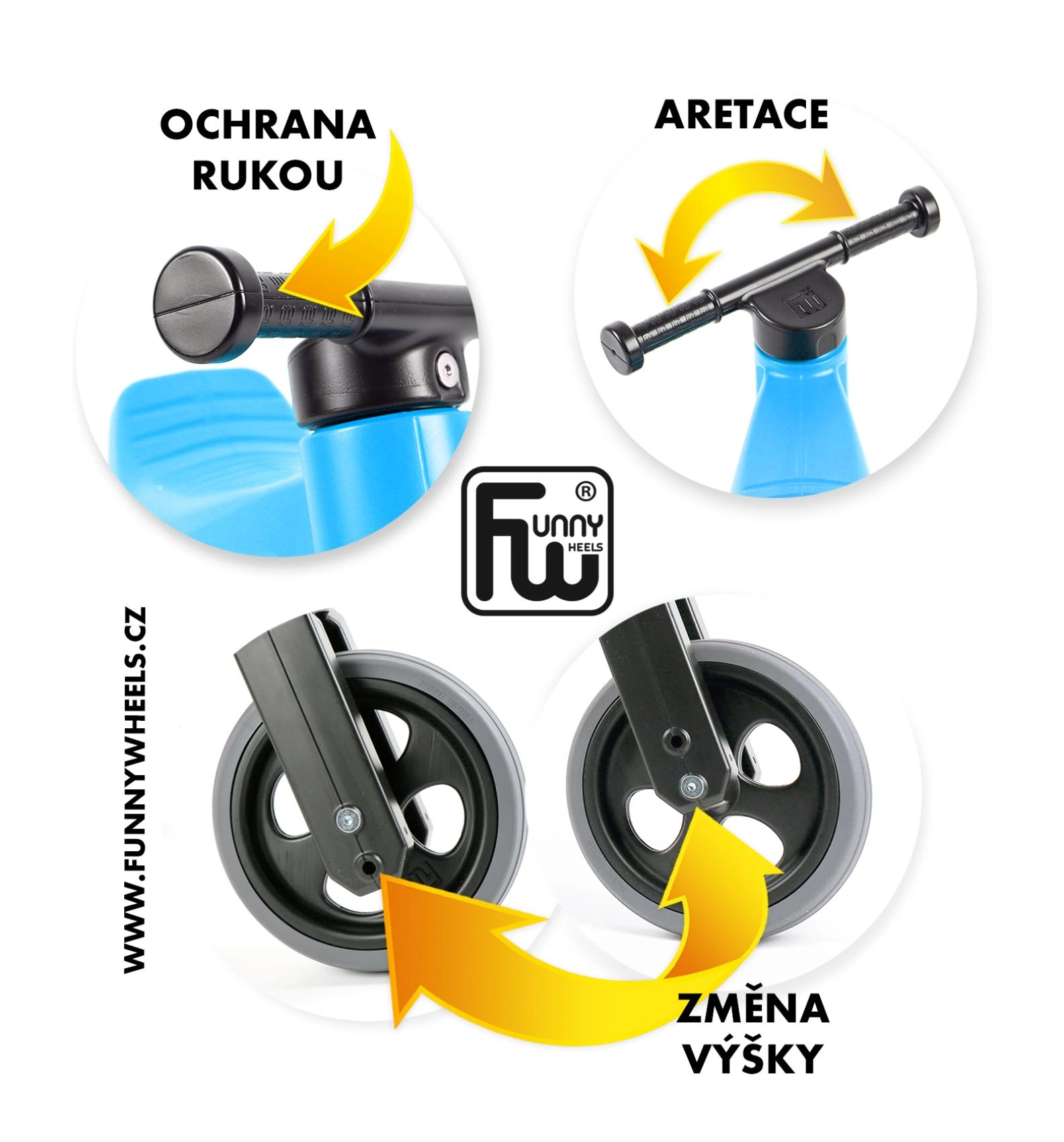 Piiratud kahvli pöördenurk hoiab ära lenksu ülepööramise, laiad otsakorgid kaitsevad käsi ja vastupidaval ohutul plastil on siledad ühenduskohad.