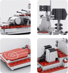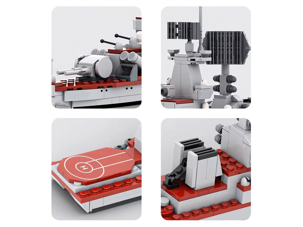 See ehituskomplekt pakub tunde põnevat kokkupanekut ja mõjuva tulemuse riiulil. Tänu kindlalt ühenduvatele klotsidele loote stabiilse konstruktsiooni rikkaliku varustusega – radaritest ja kahuritornidest kuni tekiehitiste ja ülemiseehituseni. Realistlikku ilmet toetavad komplektis olevad kleebised, mis annavad mudelile autentse välimuse.