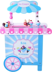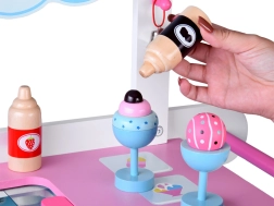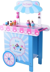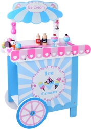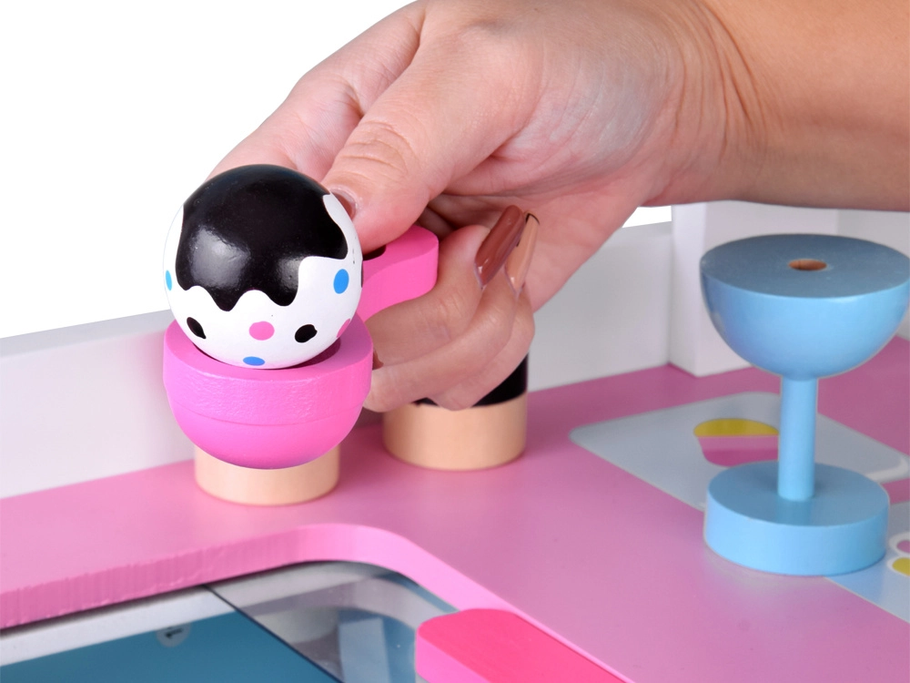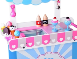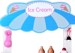 See stiilne laste jäätisekäru õrnades roosades ja sinistes toonides on ideaalne poe- ja kohvikumänguks. Ülemine lett toimib müügipinnana jäätisepallide, kornettide ja pulgajäätiste väljapanekuks, selle all on suur riiul ja liuglev “külmik” maiuste ja tarvikute hoiustamiseks. Praktilised kaks konksu ja hõbedane kelluke loovad autentse serveerimiskogemuse.