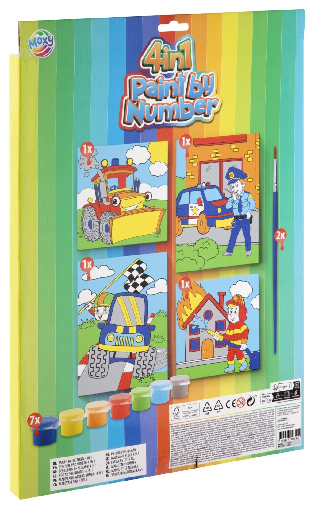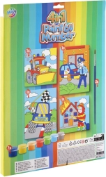 - 4 eeltrükitud kartongpilti, akrüülvärvide komplekt, pintsel, juhend