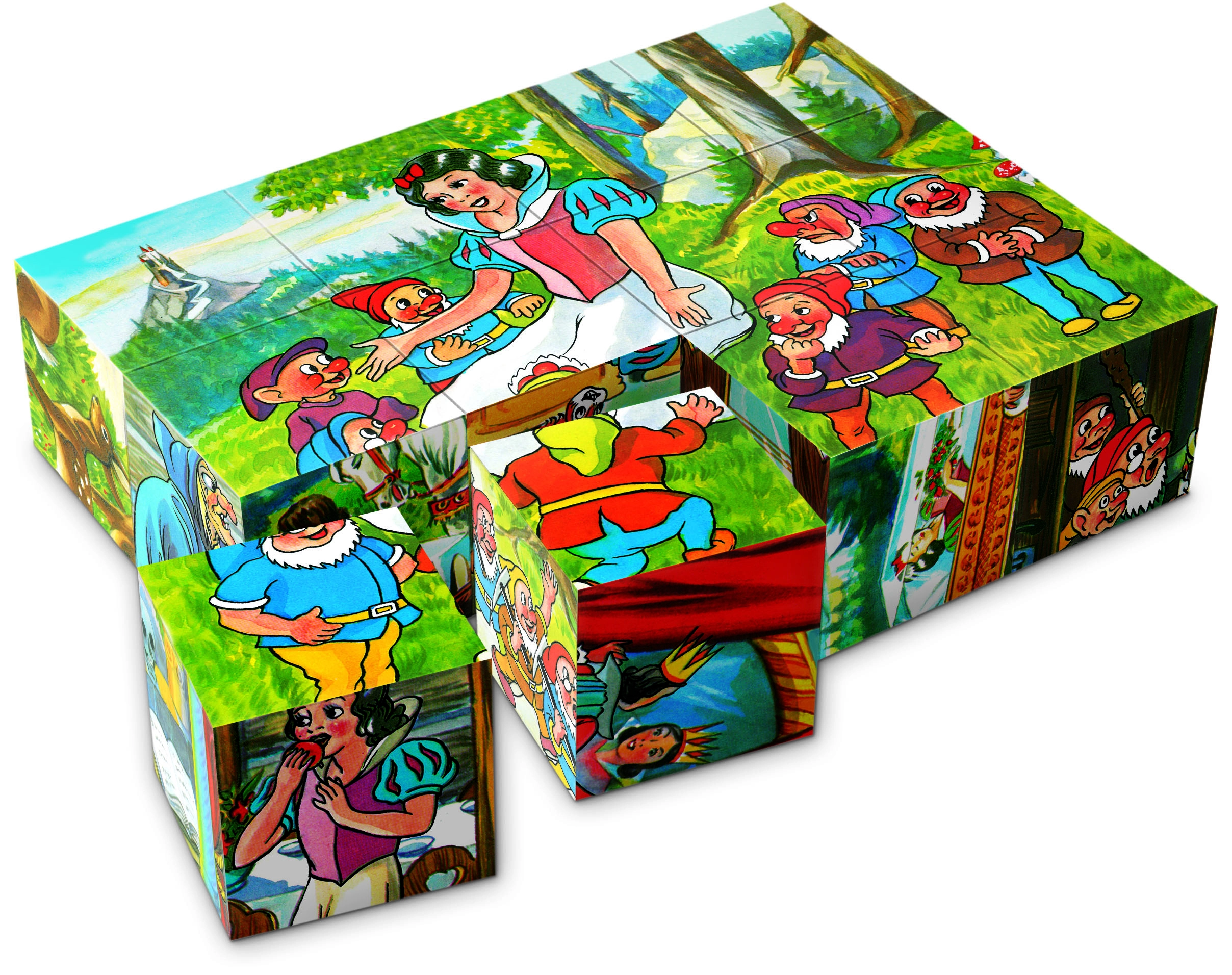Selle ajatu mänguasjaga tutvuvad lapsed mängulisel viisil Lumivalgekese looga. Puidust klotsid on vastupidavad, meeldivad puudutusele ning trükitud pind võimaldab moodustada mitu erinevat pilti. Suurepärane silma-käe koordinatsiooni, kannatlikkuse ja loogilise mõtlemise arendamiseks.