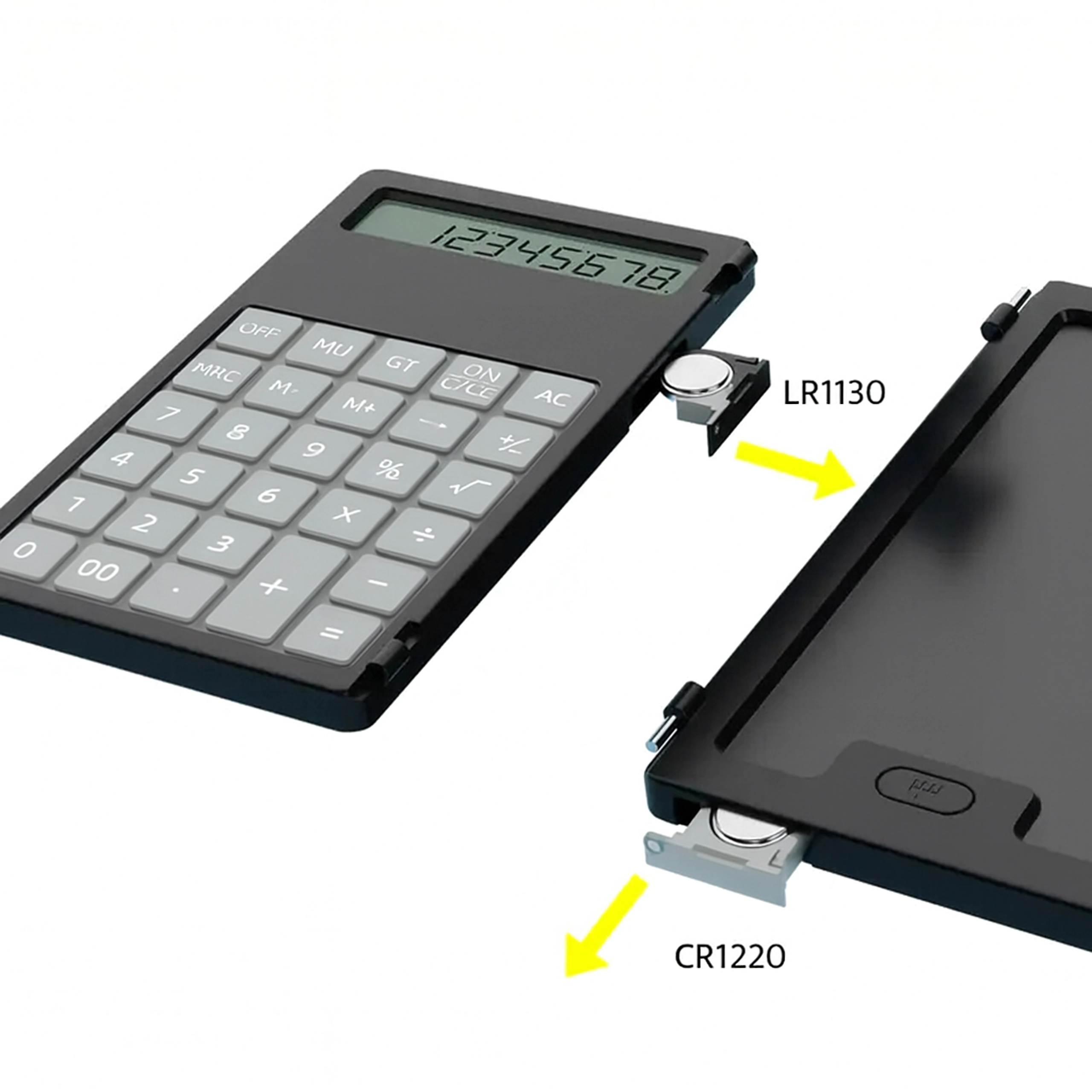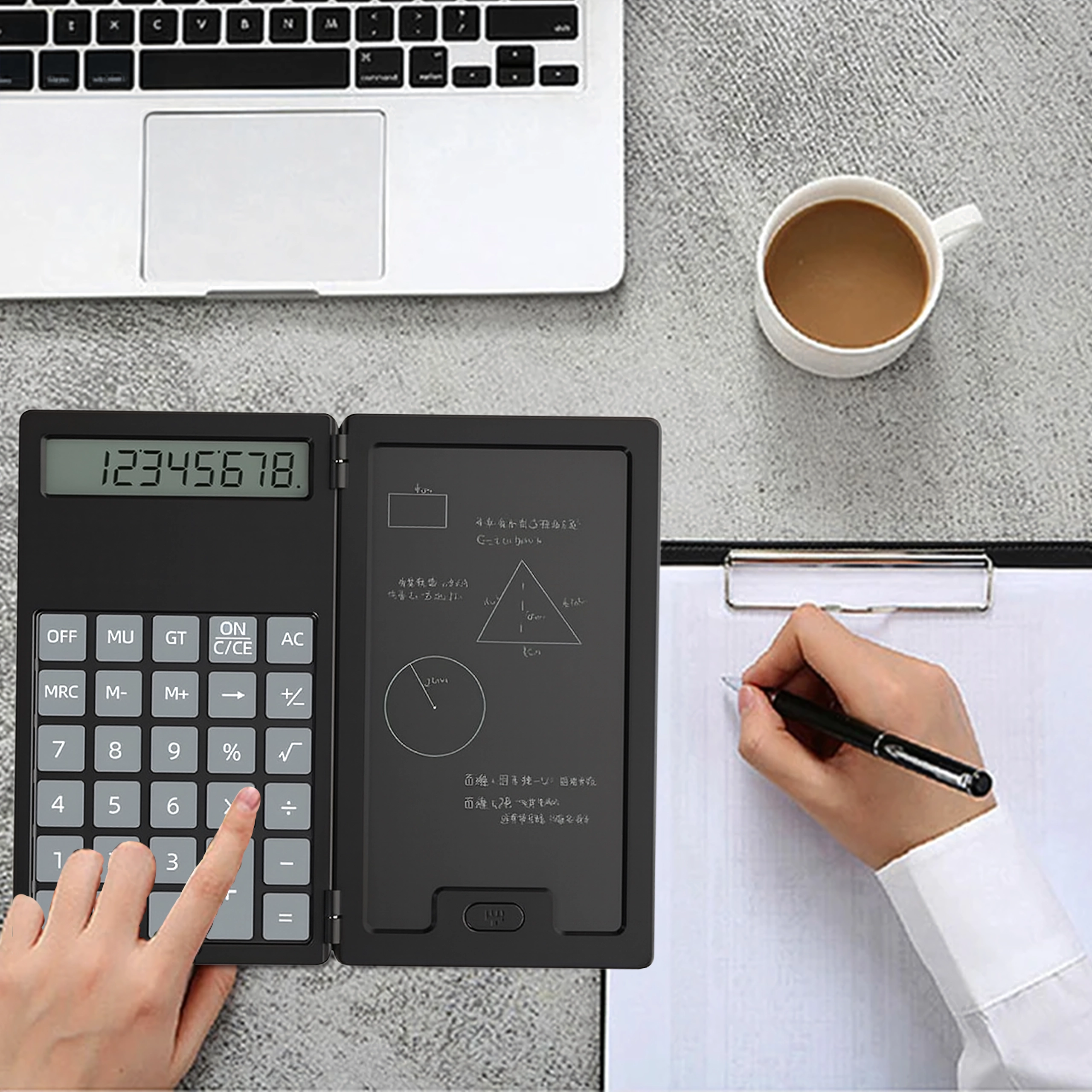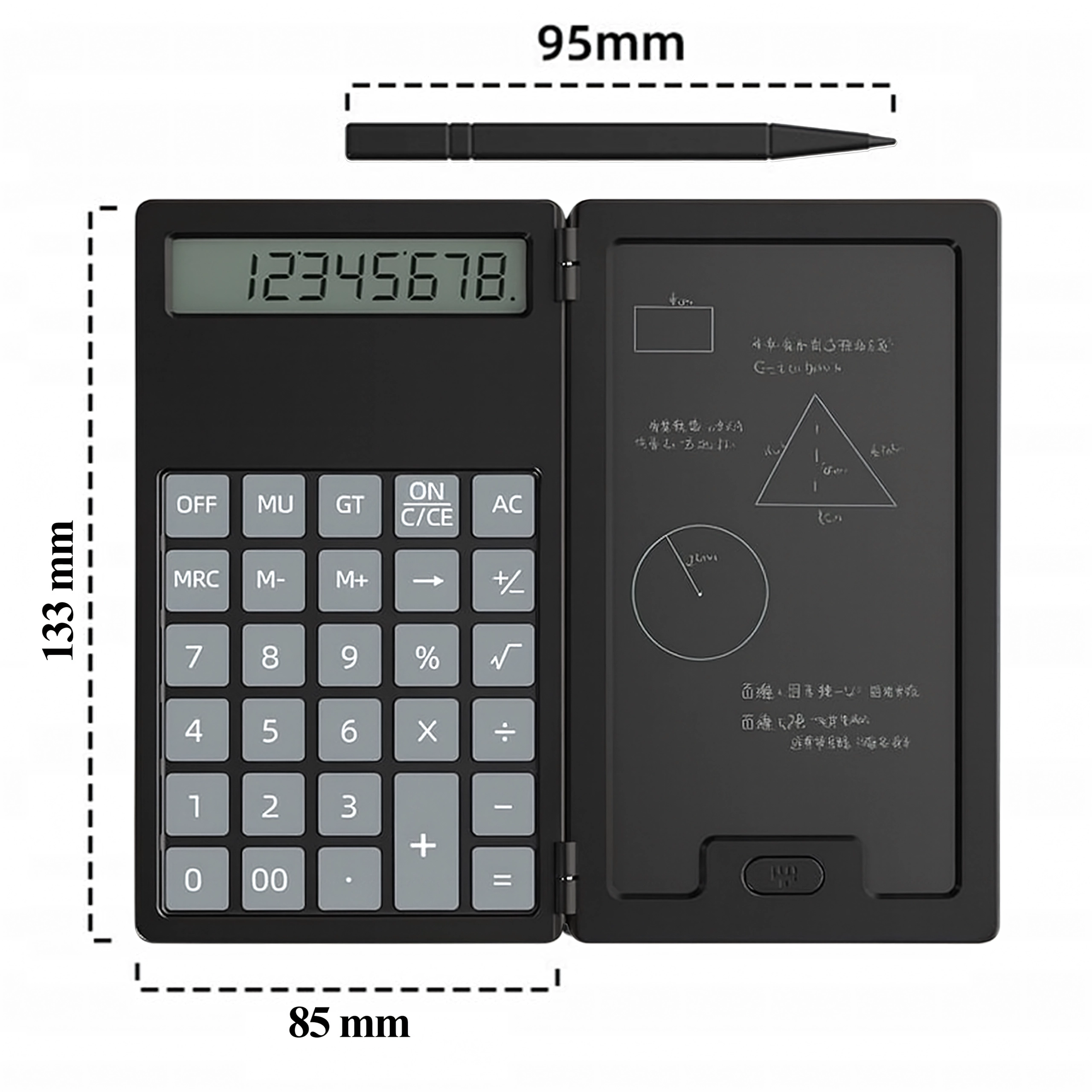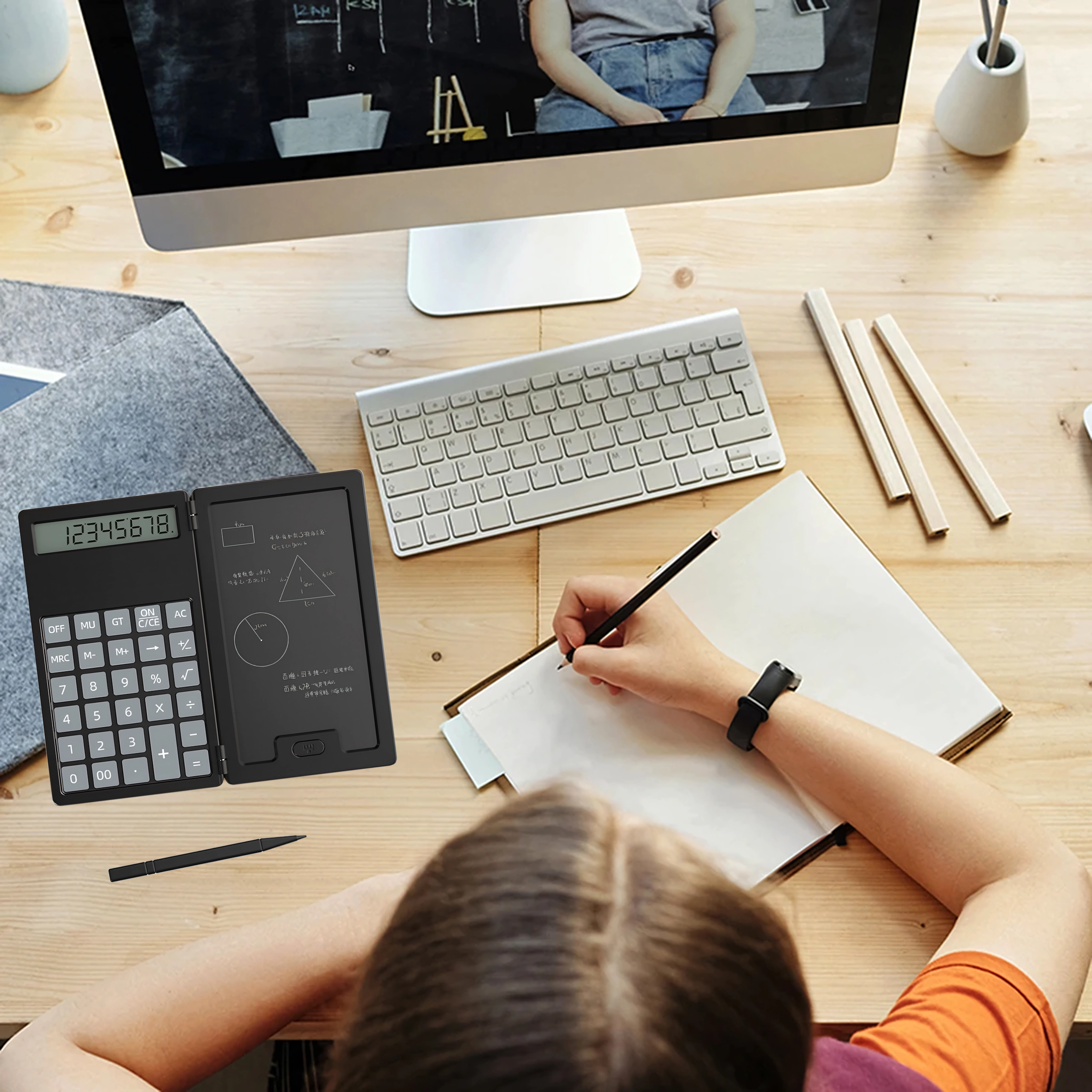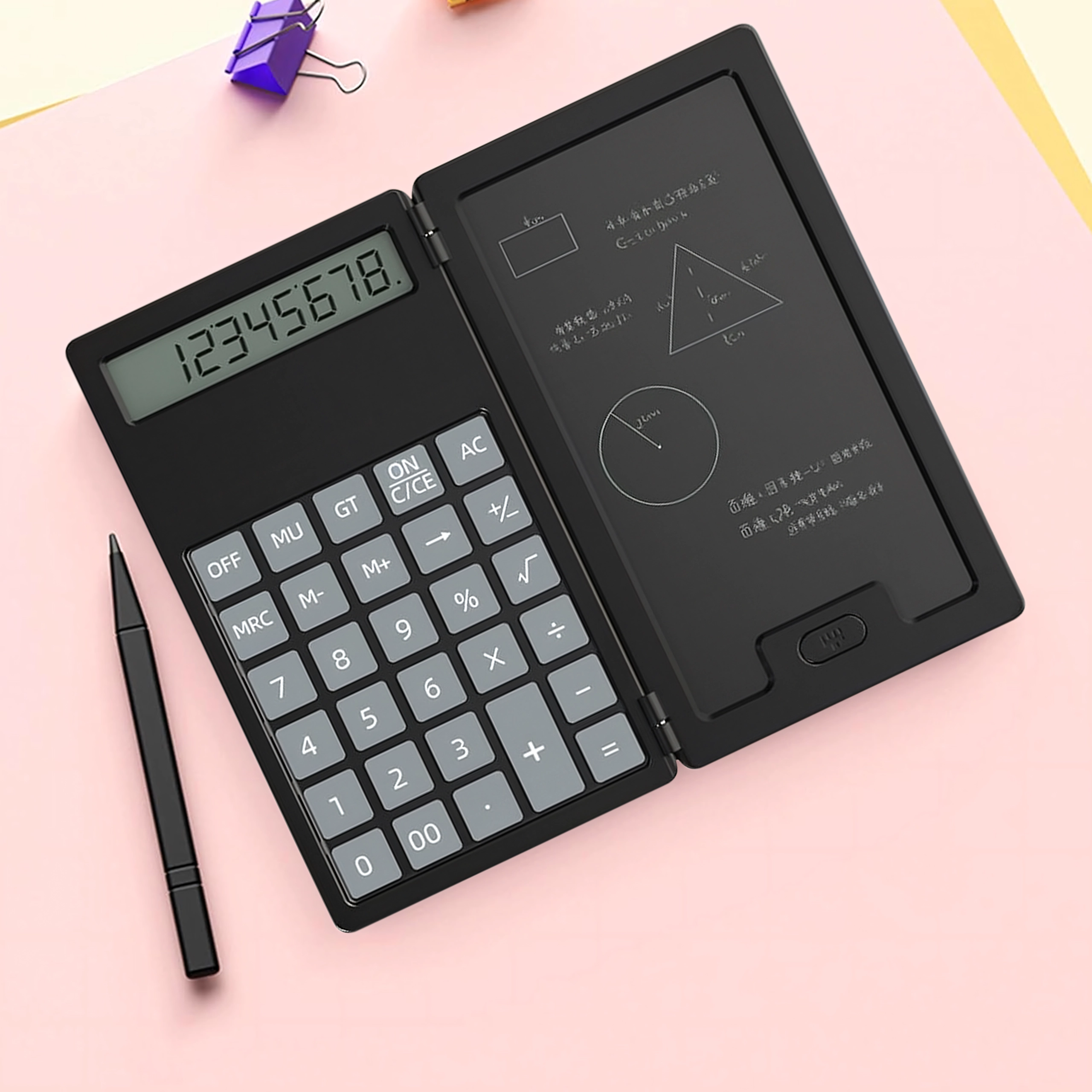 Vasakul täpne kalkulaator, paremal LCD-kirjapind kiirete märkmete jaoks – ideaalne arvutusteks, valemiteks ja visanditeks ilma paberita.