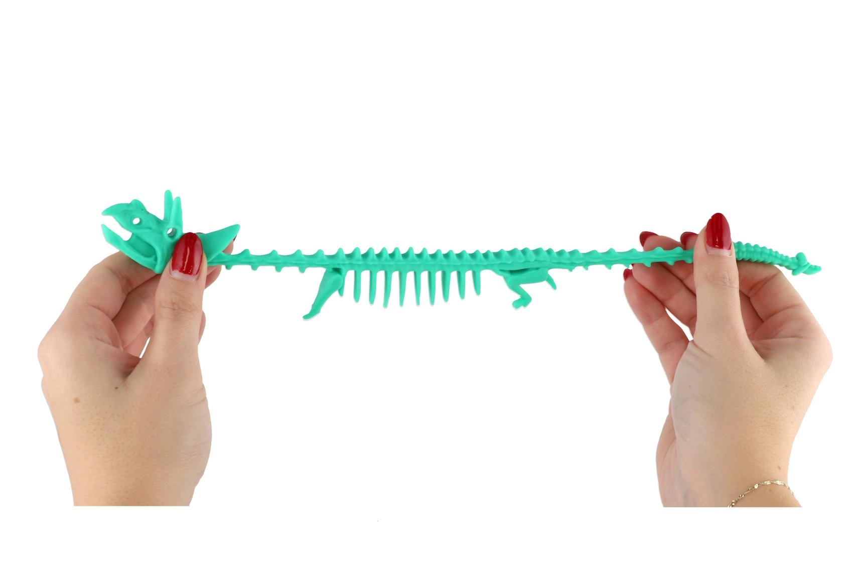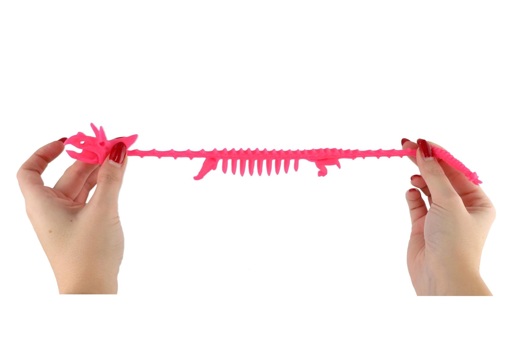 Värviline antistress-mänguasi dinosauruse luustiku kujul pehmest ja mõnusast silikoonist, ideaalne pigistamiseks, venitamiseks ja rahunemiseks stressiolukorras. Pikkus 22 cm, saadaval 6 erksas toonis, suurepärane nii lastele kui ka täiskasvanutele kui fidget-mänguasi pingete maandamiseks.