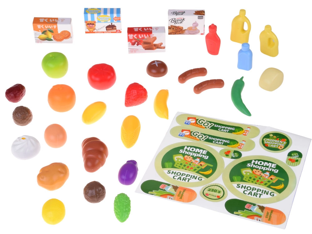 Komplektis on puu- ja köögiviljad, saiakesed, joogid, karbikesed ja kleepsud. Lapsed saavad nautida realistlikku ostlemist ja toiduainete sortimist.