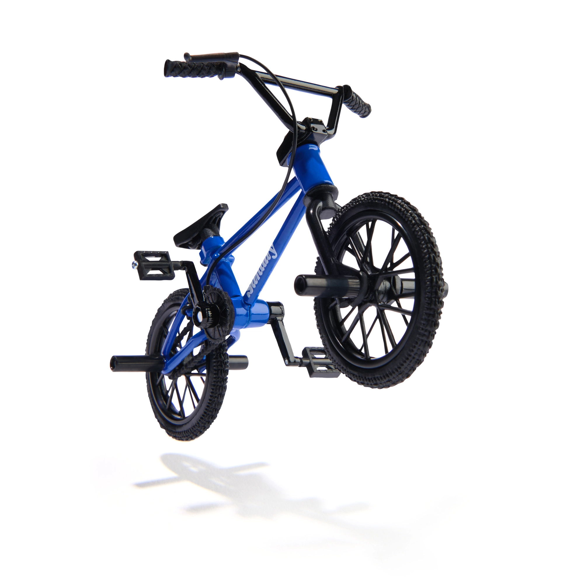 Sinine sõrme-BMX SUNDAY detailse raami, kodarate, pedaalide ja pegsidega võimaldab harjutada freestyle-trikke otse laual.