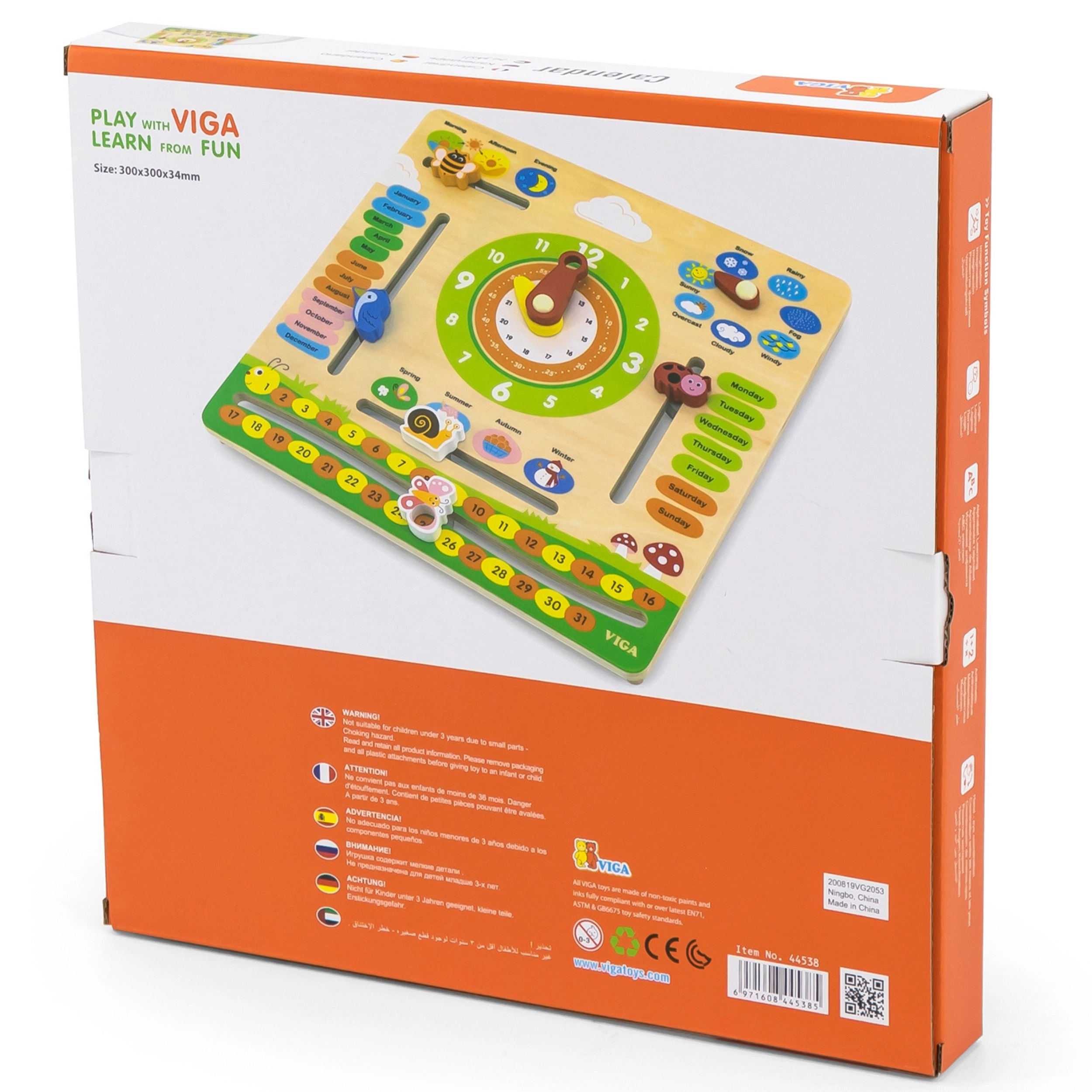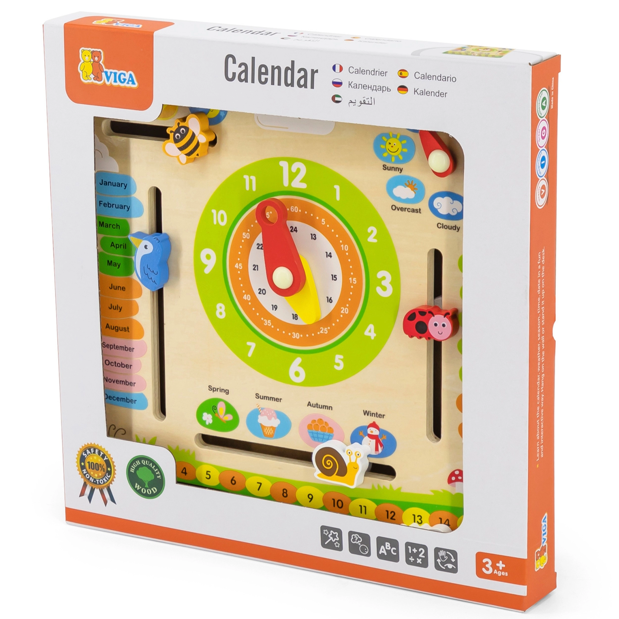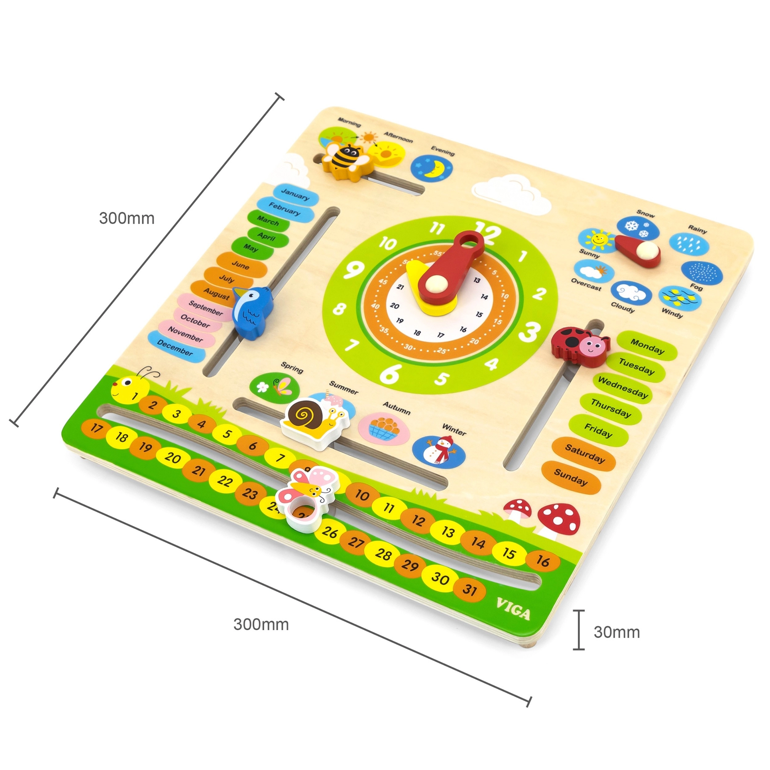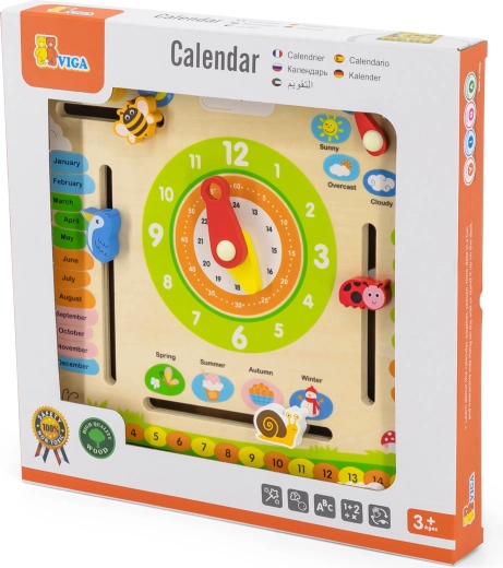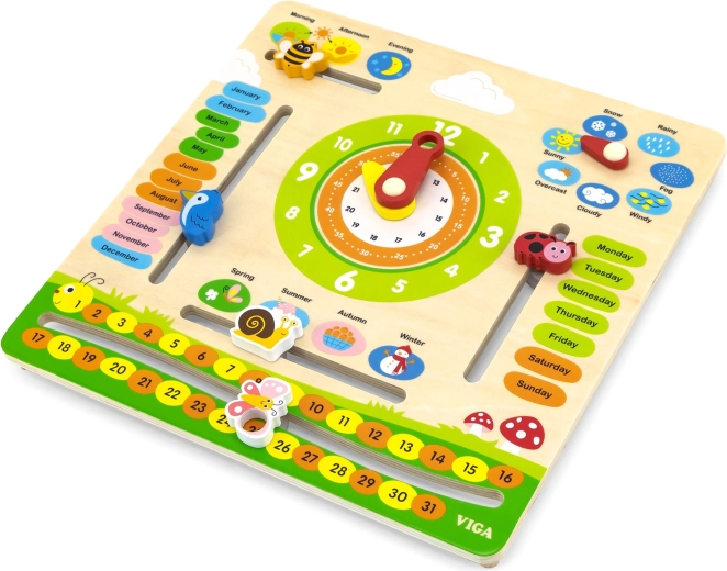 Viga puidust õppetahvel ühendab ühte selgesse paneeli kalendri, kella ja ilma teemad. Lapsed õpivad mängulisel viisil inglise keeles kuude, nädalapäevade, aastaaegade ja ilma nimetusi ning harjutavad ühtlasi analoogkellal aja määramist. Värvilised elemendid ja vastupidav teostus innustavad igapäevasele kasutusele.