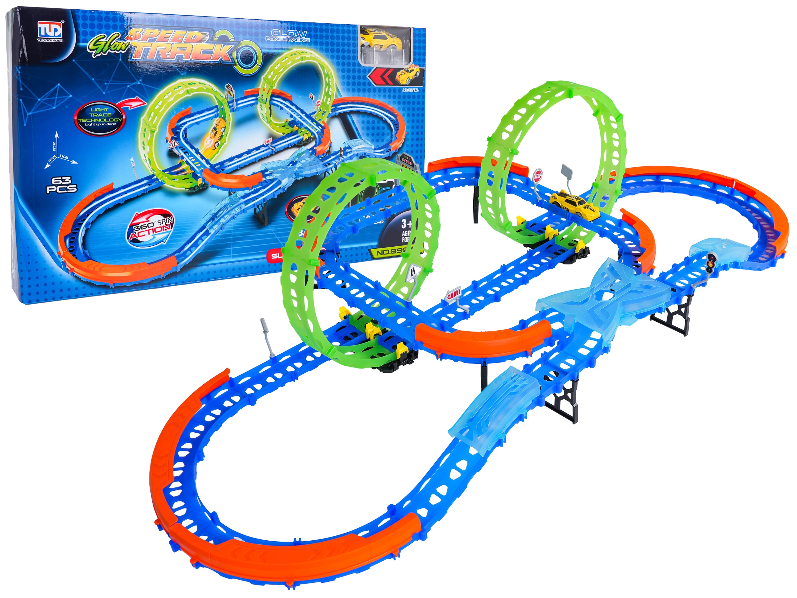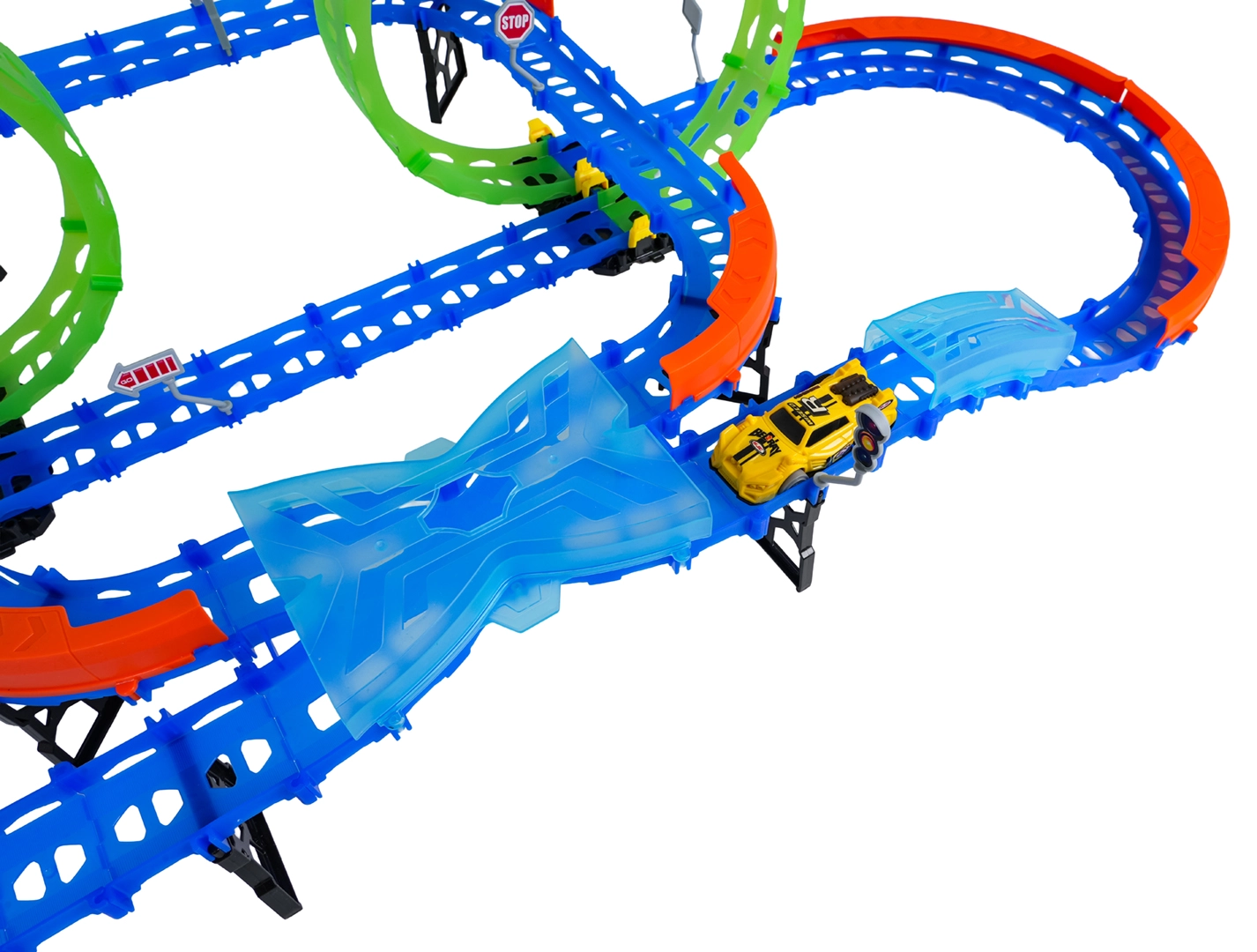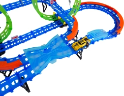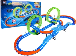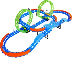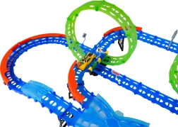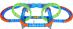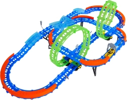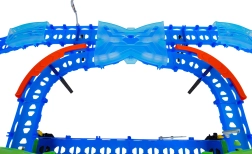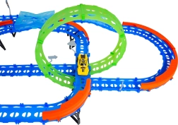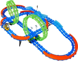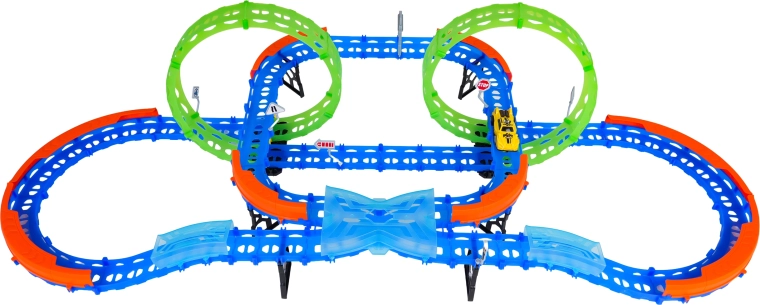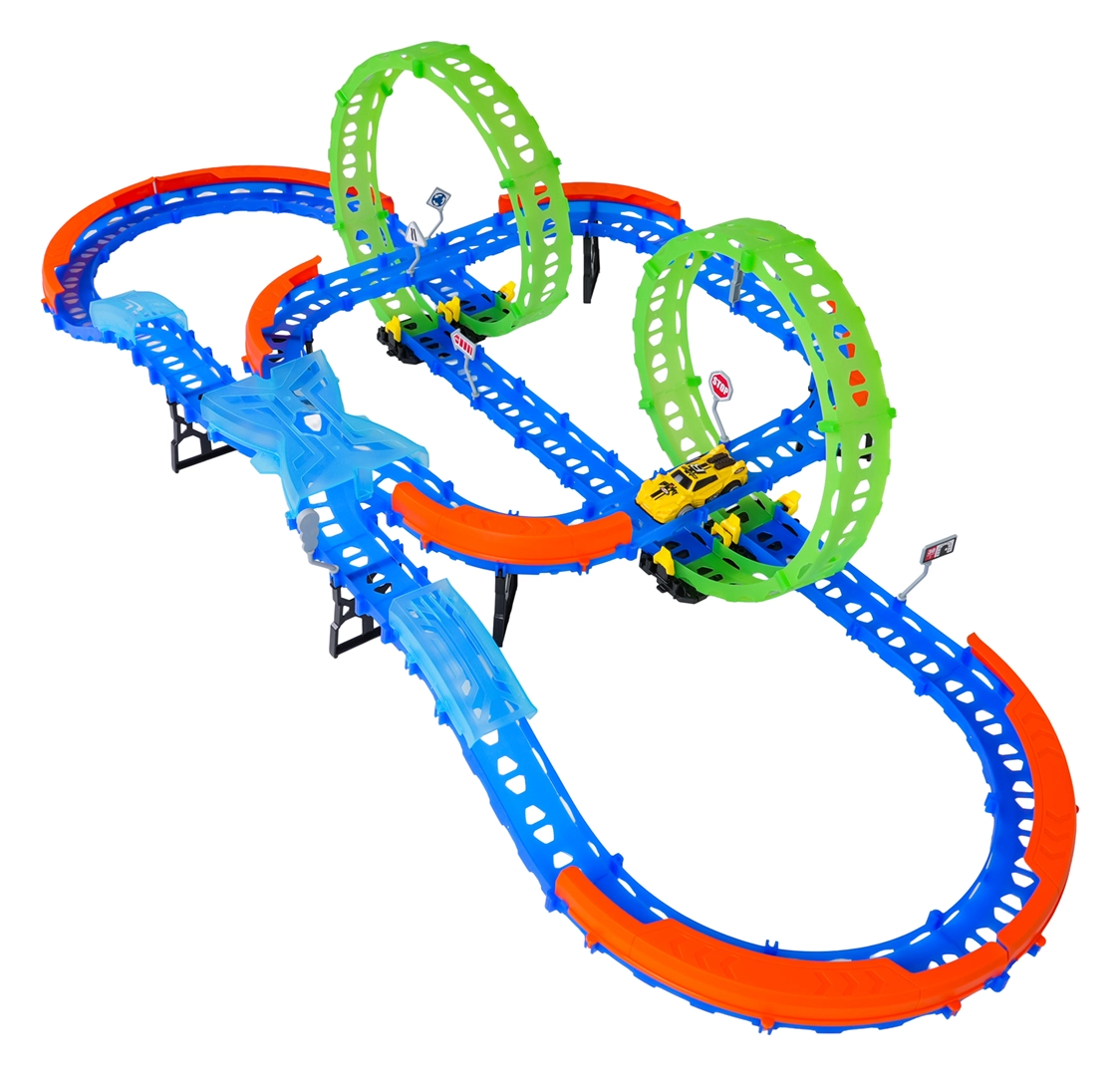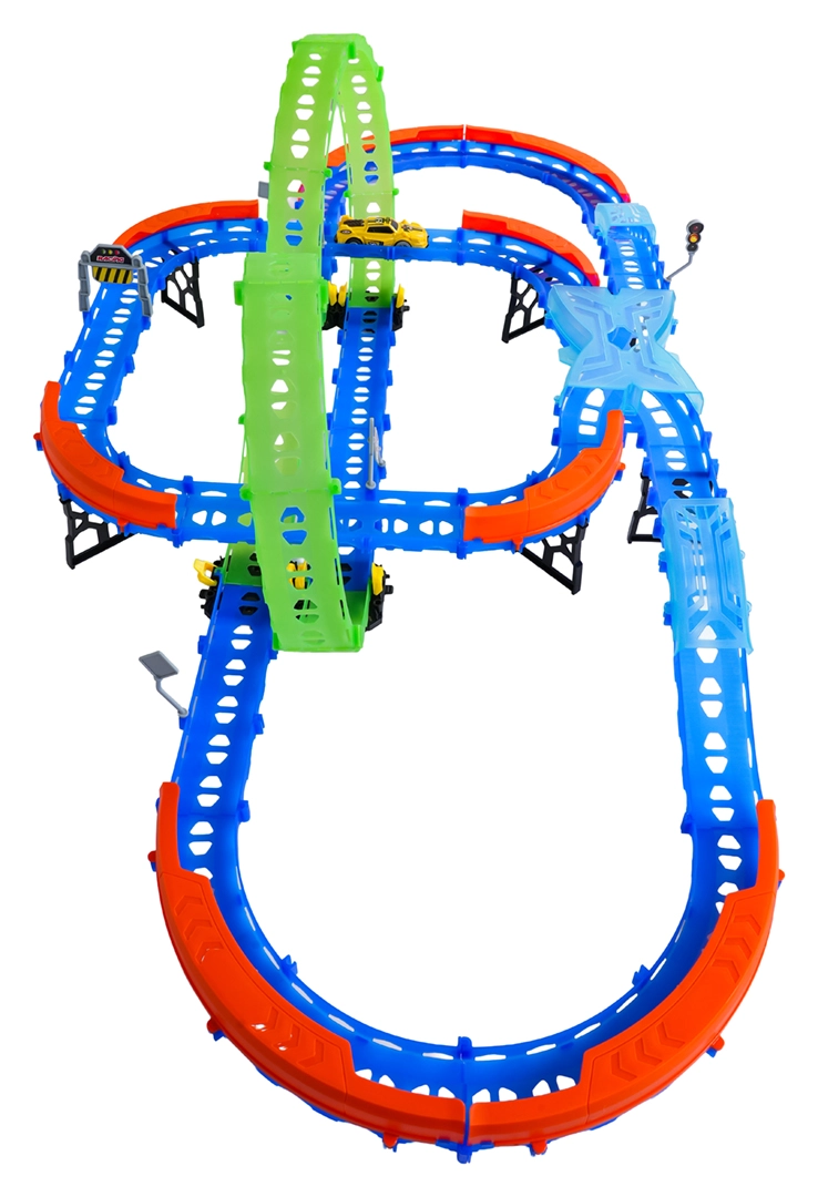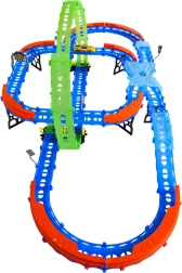 Ehita värvikas rada sildade, kurvide ja kahe silmusega ning vaata, kuidas väike auto kihutab suurel kiirusel. Fluorestsents-elemendid helendavad pimedas pärast valgusega laadimist, muutes võidusõidu veelgi dünaamilisemaks ja lõbusamaks.