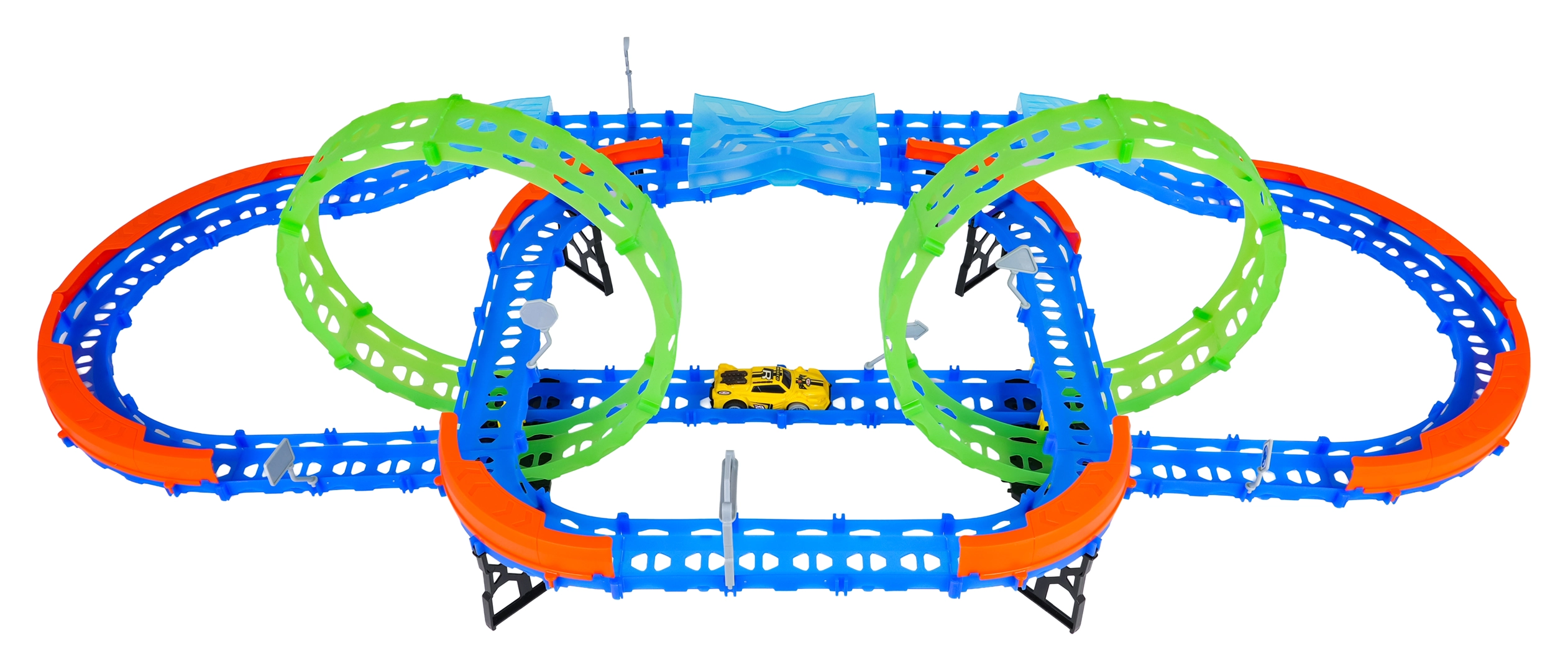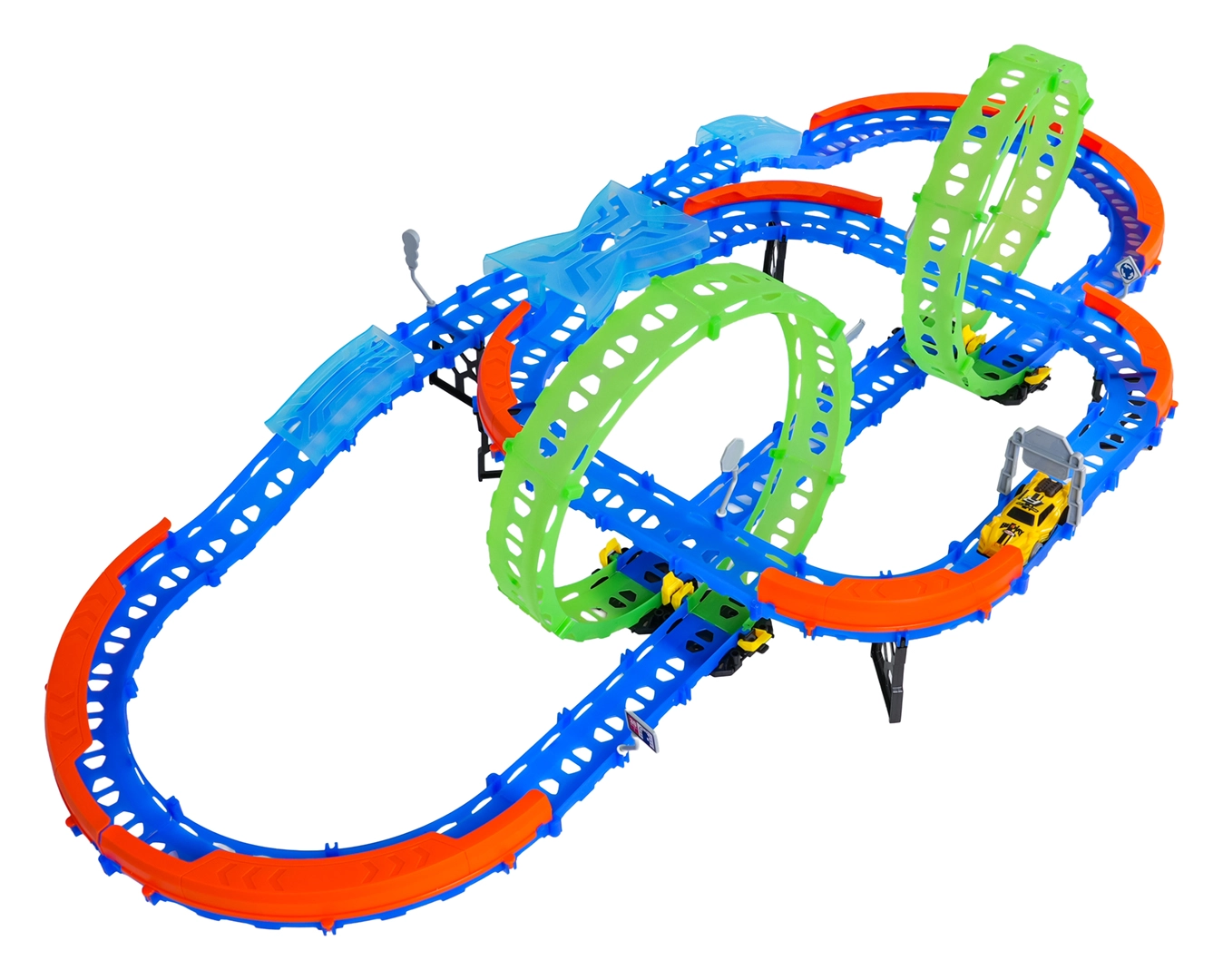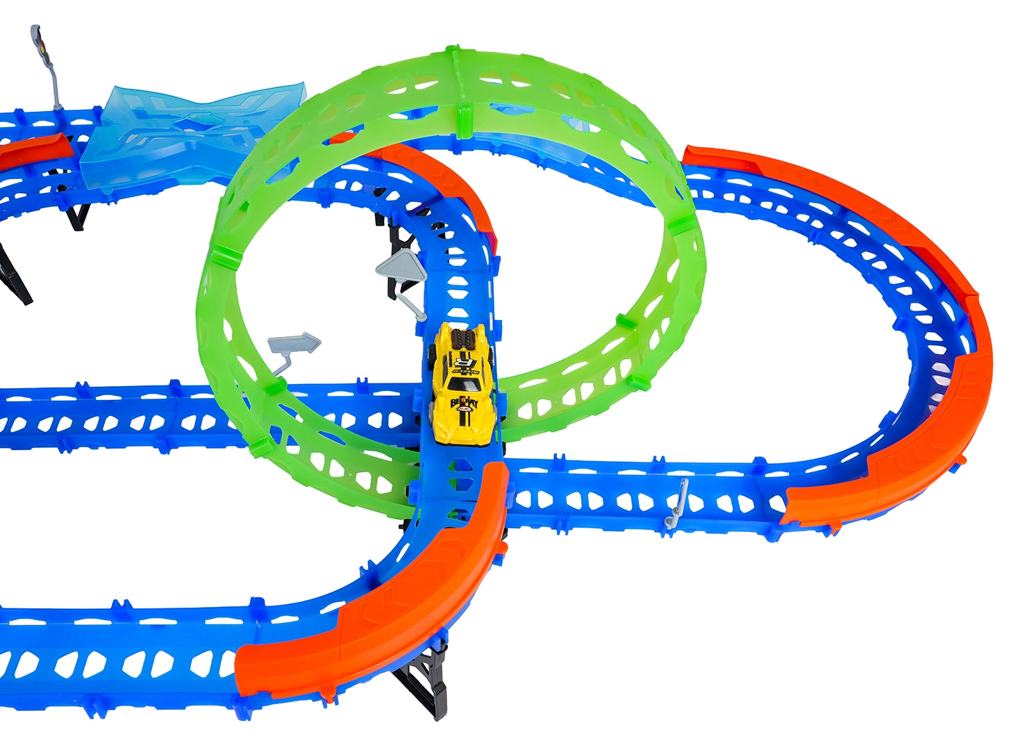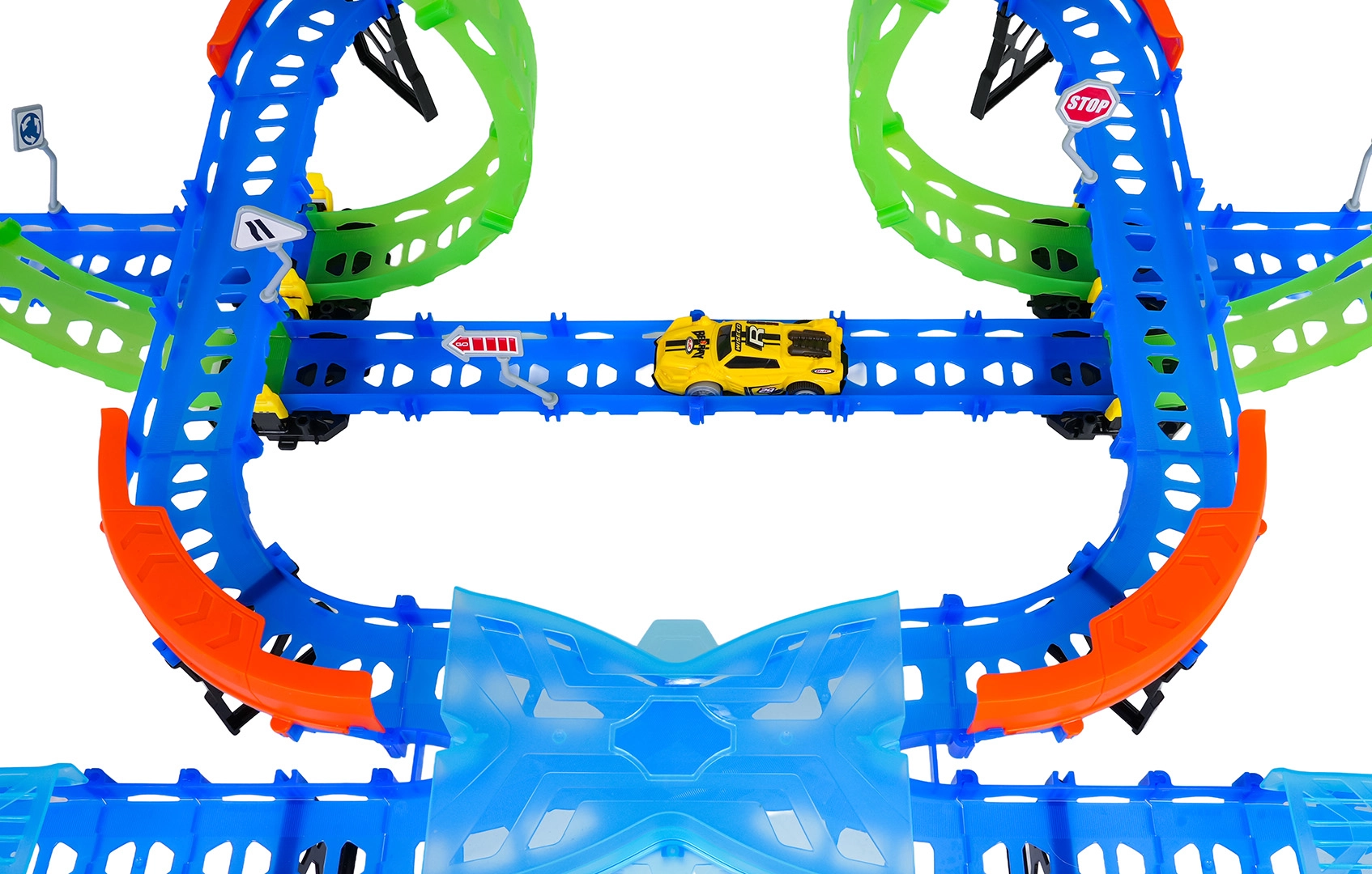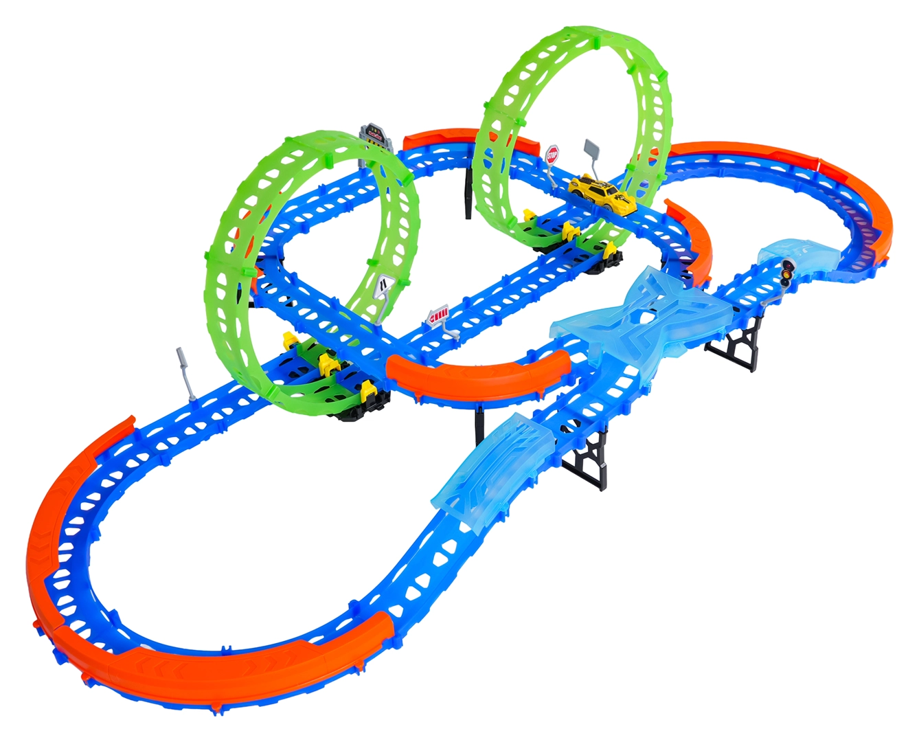 Ehita värvikas rada sildade, kurvide ja kahe silmusega ning vaata, kuidas väike auto kihutab suurel kiirusel. Fluorestsents-elemendid helendavad pimedas pärast valgusega laadimist, muutes võidusõidu veelgi dünaamilisemaks ja lõbusamaks.
