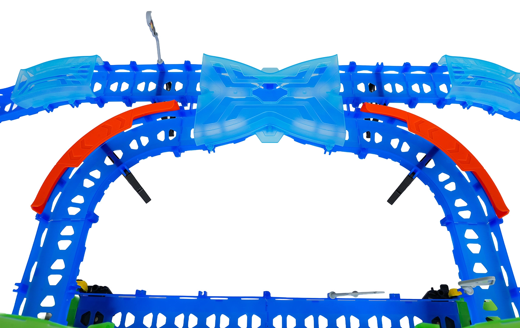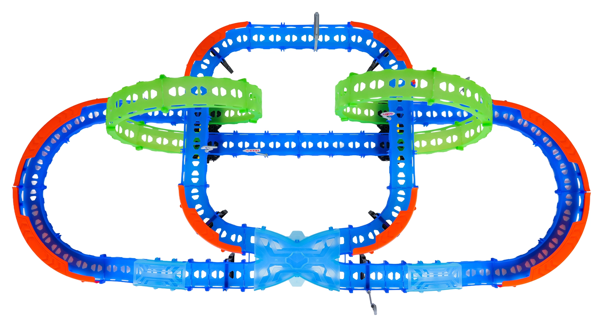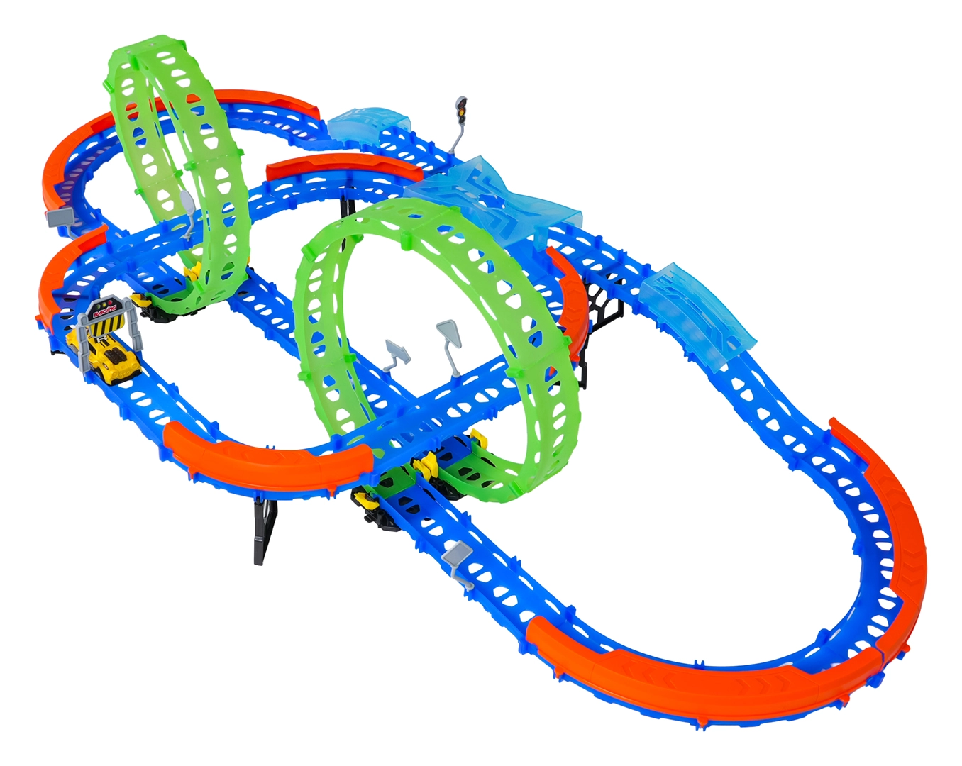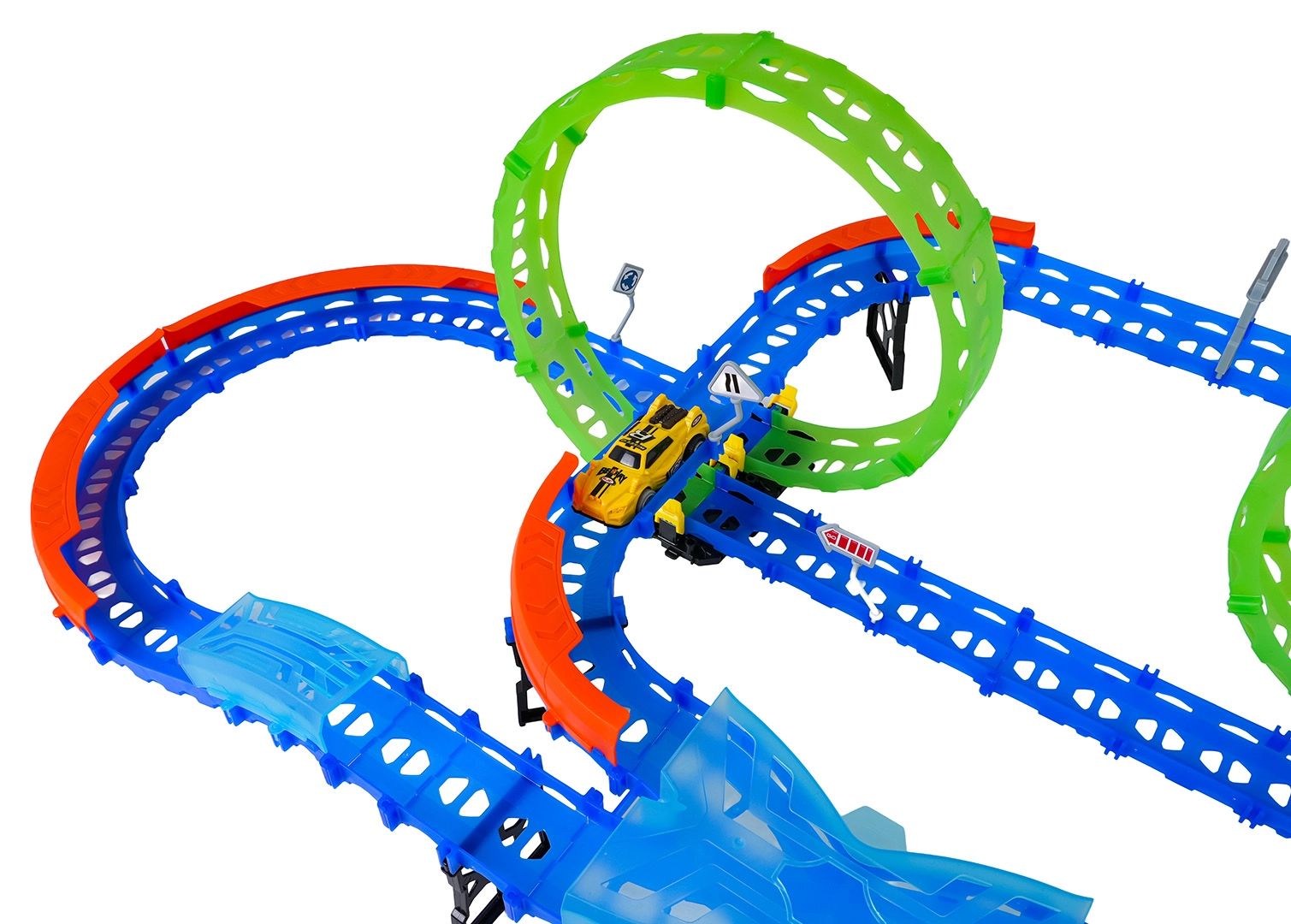 Ehita värvikas rada sildade, kurvide ja kahe silmusega ning vaata, kuidas väike auto kihutab suurel kiirusel. Fluorestsents-elemendid helendavad pimedas pärast valgusega laadimist, muutes võidusõidu veelgi dünaamilisemaks ja lõbusamaks.