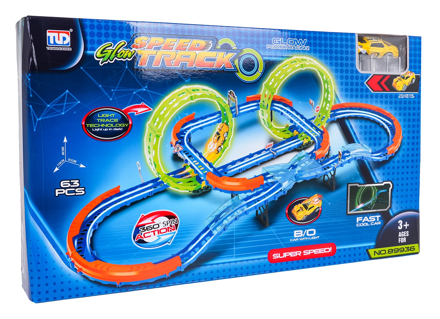 Lase fantaasial lennata selle lõbusa võidusõidukomplektiga lastele alates 3. eluaastast. See helendav võidusõidurada pakub kahte 360° fluorestsents-silmust, teravaid kurve turvabarjääridega ja kiiret valgusega väikest autot. Tänu 63 kergesti ühendatavale osale saavad lapsed ehitada oma raja ja nautida põnevat sõitu ka pimedas.