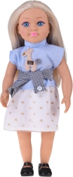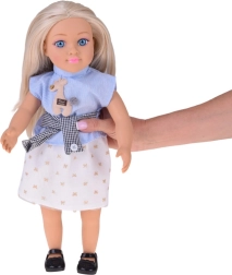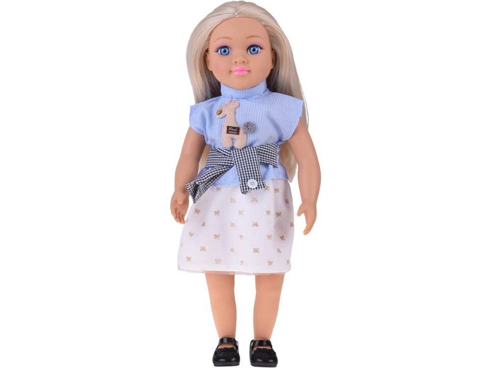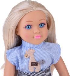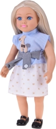 Nukk on riietatud elegantsesse komplekti – sinine triibuline topp aplikatsiooniga, šikk vöö ja kreemikas seelik kuldsete motiividega moodustavad harmoonilise rõivastuse, mida täiendavad mustad baleriinad. Tänu liikuvatele kätele, jalgadele ja peale saab nukku hõlpsasti istuma panna ja erinevatesse poosidesse seada stseenide ja lugude jutustamiseks.