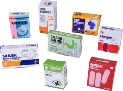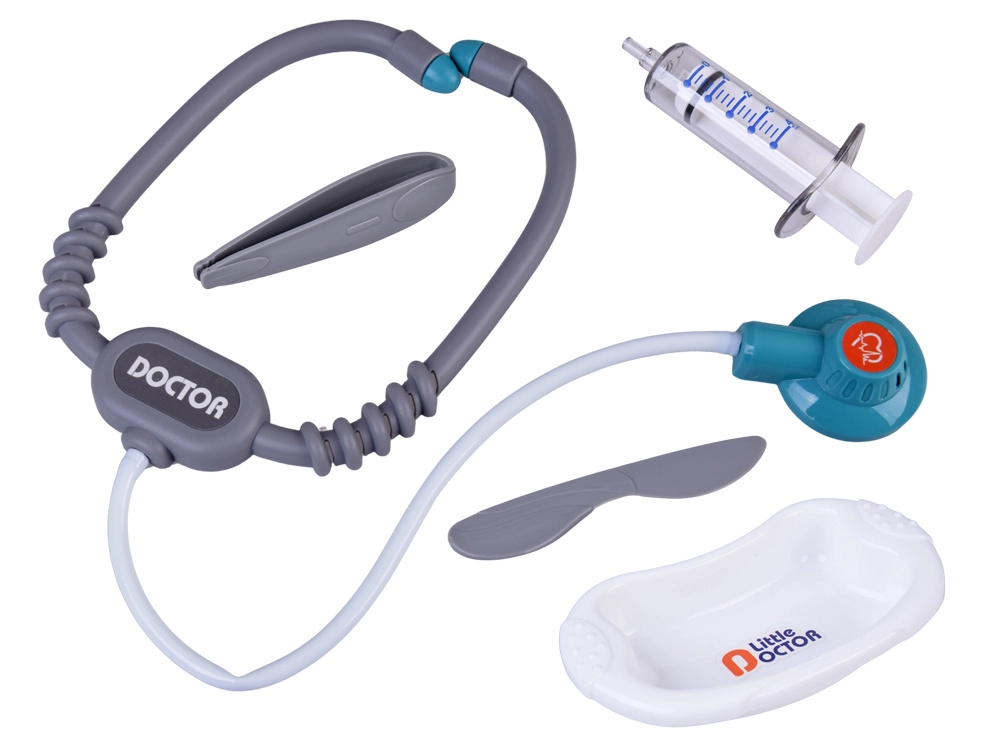 - Stetoskoop helidega, elektrooniline termomeeter, süstal, käärid, pintsetid, otoskoop, haamer, peegel, kauss, tilkinfusioon, „tablettide“ blister, „ravimite“ karbid ja pudelid