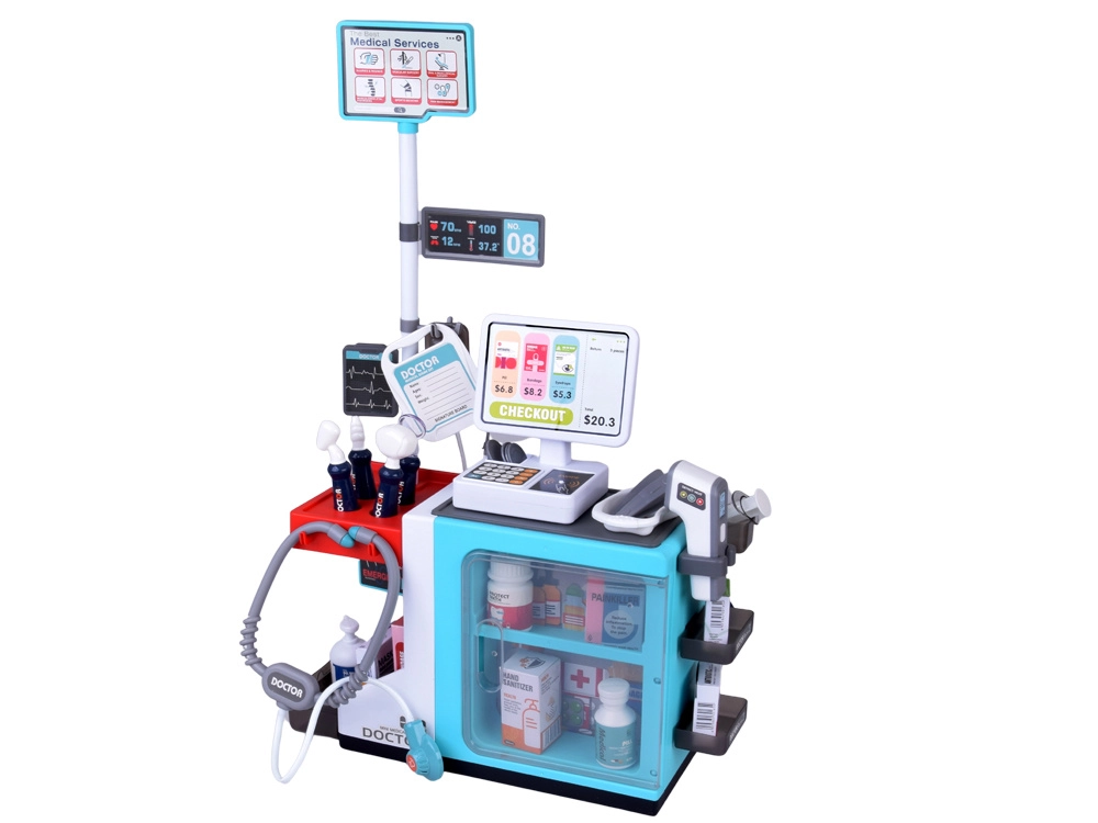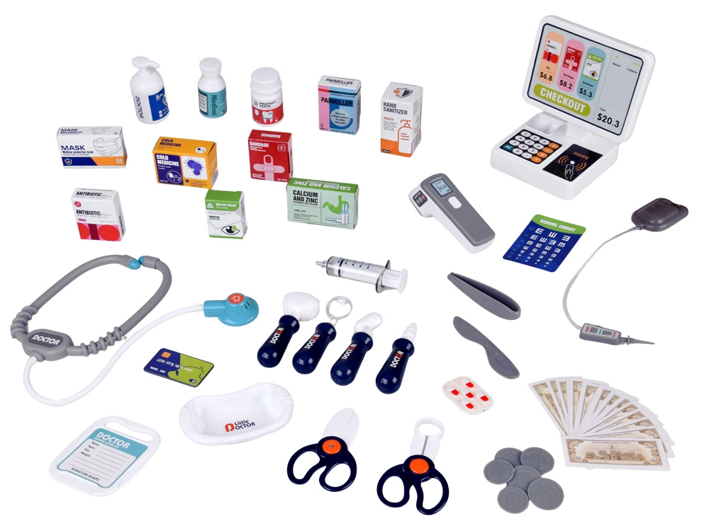 Avasta mitmekülgne laste kliinik ja apteek ühes – rikkalikult varustatud komplekt arsti, apteekri ja patsiendi rollimänguks. Tänu interaktiivsele kassale terminaliga, realistlikele tööriistadele ja rohketele tarvikutele arendab komplekt loovust, empaatiat ja õppimist läbi mängu. Komplektis on stetoskoop südamehelidega, elektrooniline termomeeter, maksekaart ja raha ning hoiukapid korrastatud mänguks.