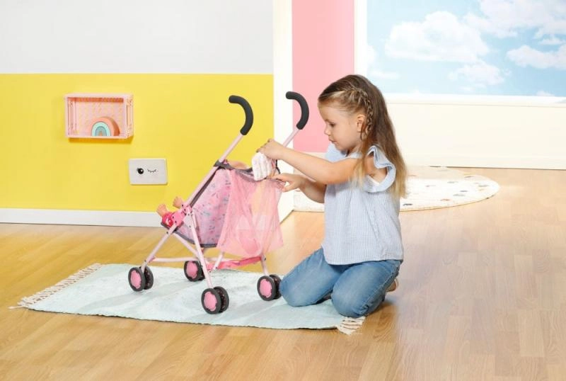 BABY borni nukukäru sobib suurepäraselt igapäevasteks jalutuskäikudeks ja mänguks kodus. Kerget metallraami, mugavaid vahust käepidemeid ja nelja topeltratast on lihtne juhtida ka väikeste laste kätega. Rõõmsa mustriga iste on varustatud turvarihmadega, mis hoiavad nuku kindlalt paigal.