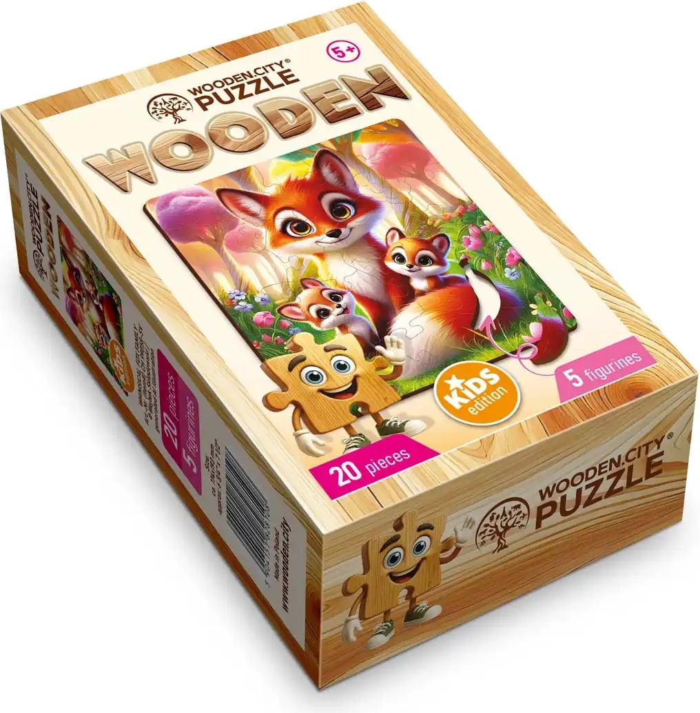 Avastage puidust puslede WOODEN CITY lummus. See armas 20 tükist koosnev rebasepere pakub lastele korraga nii lõbu kui ka õppimist. 5 ainulaadset kujutükki, täpne laserlõikus ja siledad, ohutud servad tagavad mugava ja turvalise kokkupaneku. Komplektis on eraldi abipilt lihtsamaks alustamiseks.