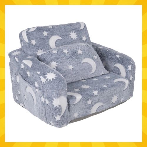 Pehme mugavus ja lõbu üheskoos – kokkuklapitav laste tugitool Kruzzel muutub hõlpsasti lamamistooliks lugemiseks, puhkuseks ja muinasjuttudeks. Ülkerge, ohutu ja kergesti kaasaskantav, praktilise küljetasku ning õrna plüüsist kattega. Fluorestseeruvad kuud ja tähekesed helendavad pimedas õrnalt ja loovad rahustava õhkkonna rahulikuks uinumiseks.