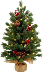 Kompaktne kunstjõulupuu, kõrgus umbes 60 cm, toob kaunilt sära igasse interjööri. Sellel on soojad LED-tuled 3 režiimiga, realistlik okastus, dekoratsiooniks punased marjad ja looduslikud käbid ning stabiilne džuutkattega alus. Kaasas on patareid 3× AG13 koheseks kasutamiseks.