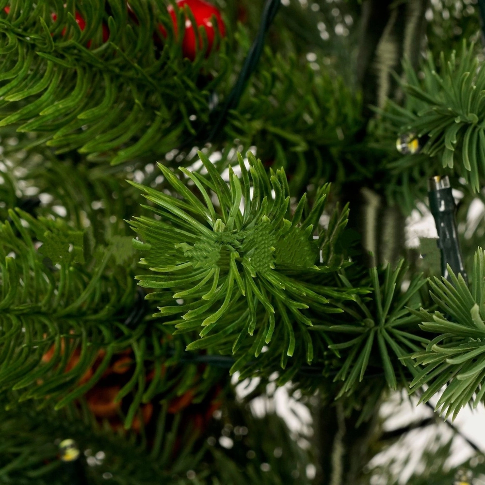 Integreeritud LED-valguskett 3 valgustusrežiimiga tagab pehme sooja valguse. Painutatav oksakonstruktsioon võimaldab lihtsat vormimist, samas punaste marjade ja käbide dekoratsioon lisab loodusliku ja klassikalise ilme. Raskusega alus, mis on ümbritsetud džuudiga, hoiab puud kindlalt paigal ja rõhutab rustikaalset stiili.
