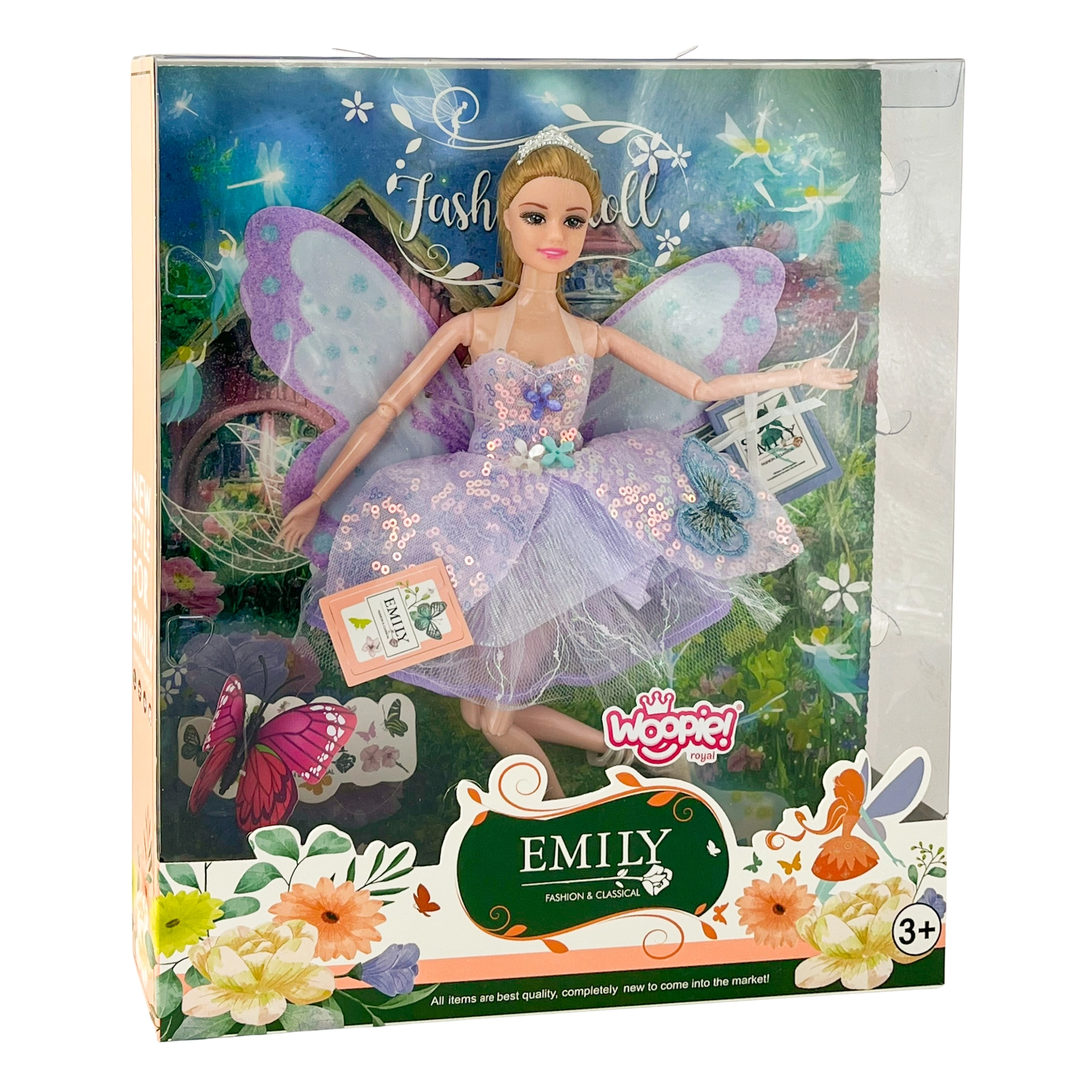 Woopie Royal haldjas Emi on loodud väikestele muinasjuttude sõpradele. Õrnad pastelsed lillad toonid, sädelevad kaunistused ja kerge tüllseelik loovad kauni välimuse, mis sobitub igasse lastetuppa. Tänu liikuvatele jäsemetele ja eemaldatavatele liblikatiibadele saavad lapsed luua oma võlumaailma stseene ja lugusid.