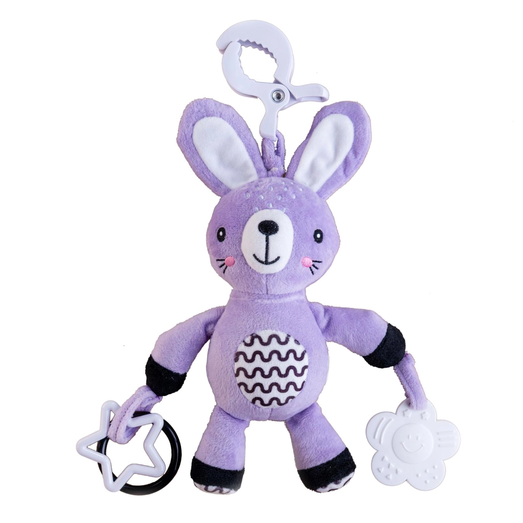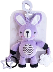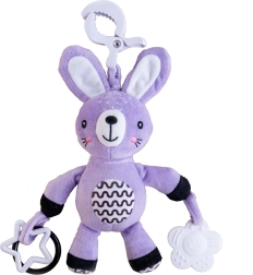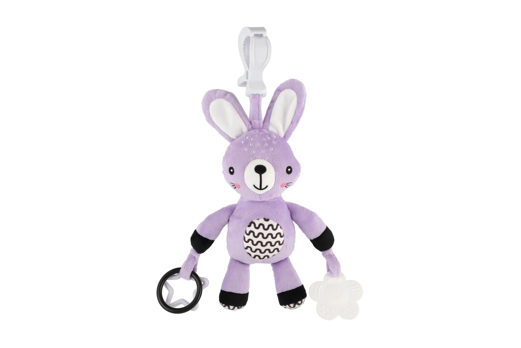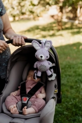 See pehme riputatav jänku saab teie beebi esimeseks sõbraks nii kodus kui ka teel. Tänu universaalsele klambrile kinnitad selle hõlpsalt vankri, turvatooli, võrevoodi või mängukaare külge. Pehme plüüskeha kutsub kaisutama, samas kui kõrinaga kõrvad ja kontrastsed detailid toetavad nii nägemis- kui kuulmistaju.