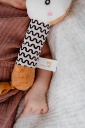 Pikk ja pehme keha on väikestel kätel kerge haarata ning must-valge muster toetab beebide visuaalset arengut.