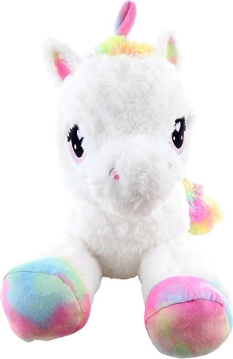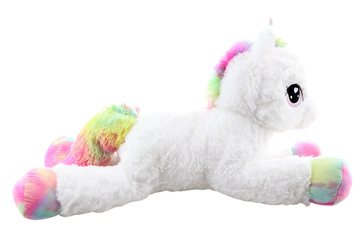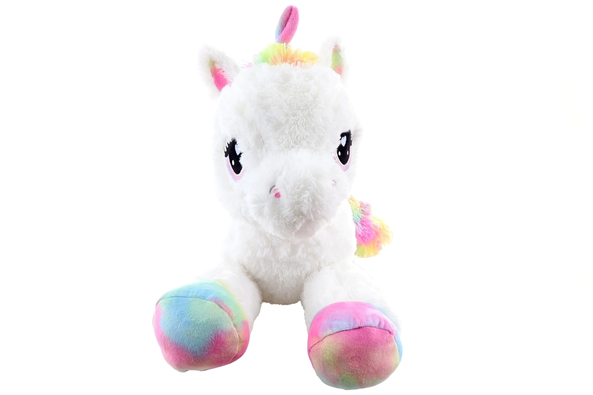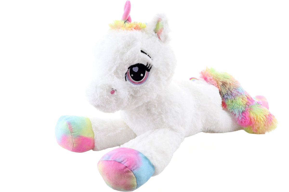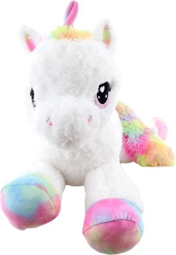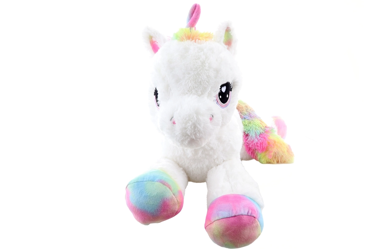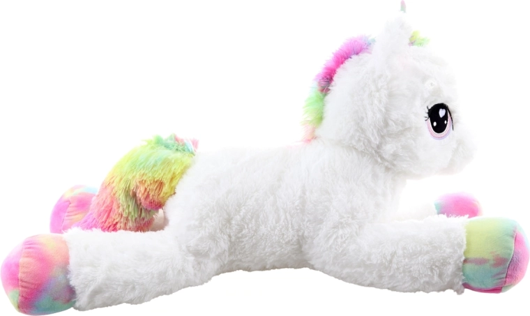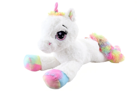 See valge plüüsist ükssarvik vikerkaarevärviliste kabjade, laka ja sabaga saab ustavaks kaaslaseks nii puhkusehetkedel kui mängides. See on valmistatud erakordselt pehmest plüüsist, mis kutsub kallistama, ning tänu lamavale asendile sobitub kenasti nii voodile kui ka lastetuppa.