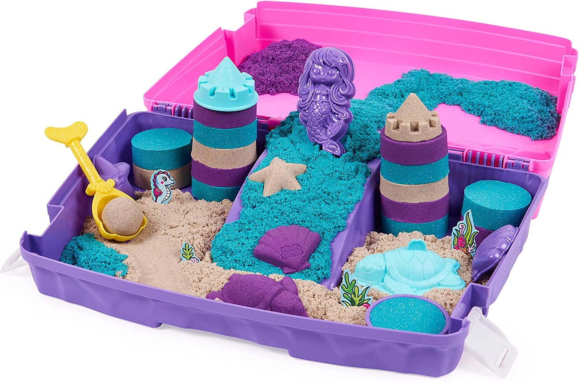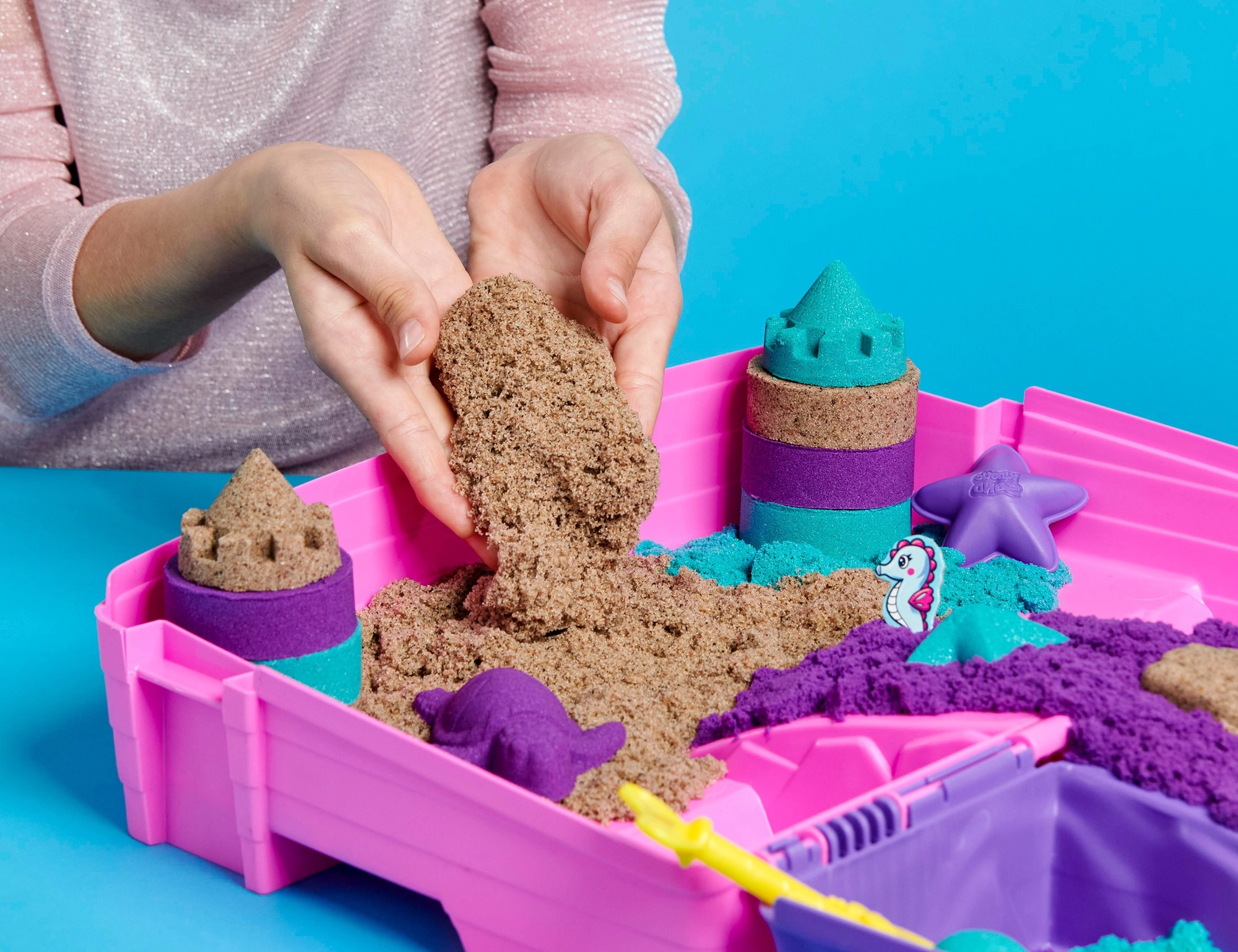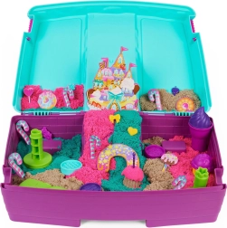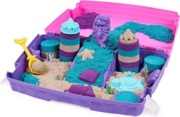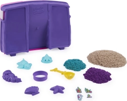 Kinetic Sand’i ainulaadne tekstuur tähendab, et terakesed tõmbuvad üksteise poole, mistõttu mass ei lenda ruumis laiali ja mudelid säilitavad puhad servad. Lapsed loovad hõlpsalt losse, torne, karpe, meritähti, kilpkonni ja merineitsisid. Komplekt sobib alates 3. eluaastast.