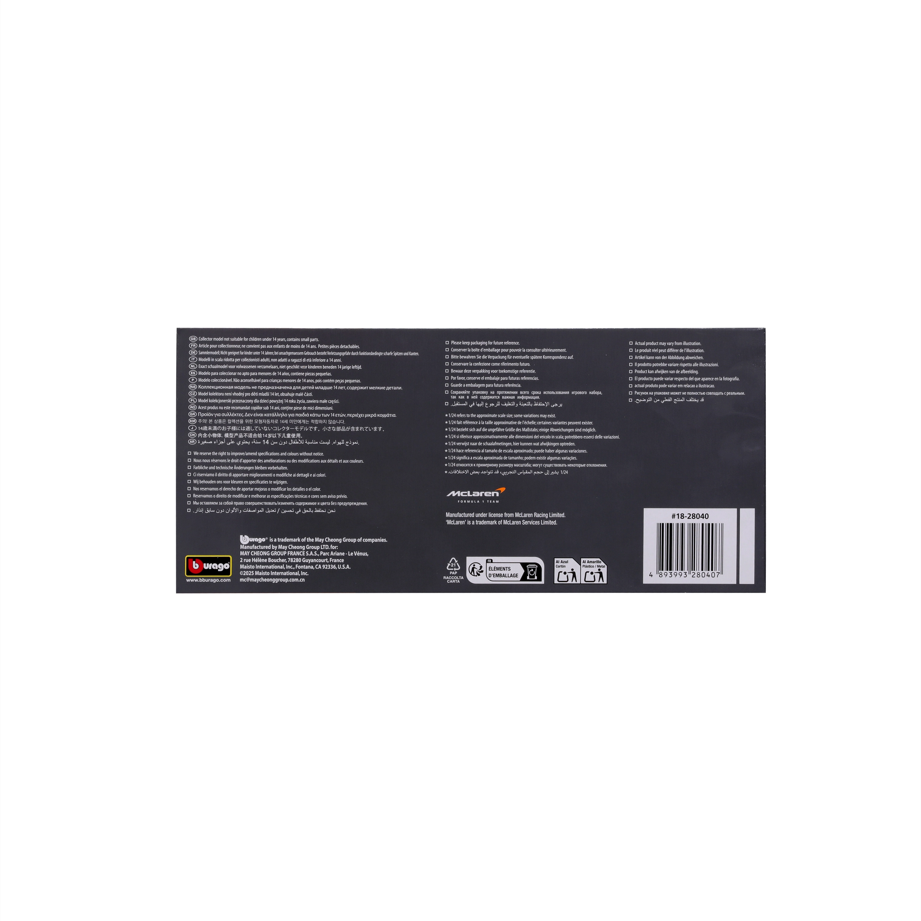See kõrgdetailne McLaren MCL38 võidusõidu üksikõrra mudel kajastab käesoleva hooaja välimust sponsorilogode, täpse aerodünaamika ja tõetruu oranži-musta värvikombinatsiooniga. Kvaliteetse värvipinna ja peene trüki tõttu näeb see välja nagu vähendatud mõõdus pärisauto, mis on stardiks valmis.