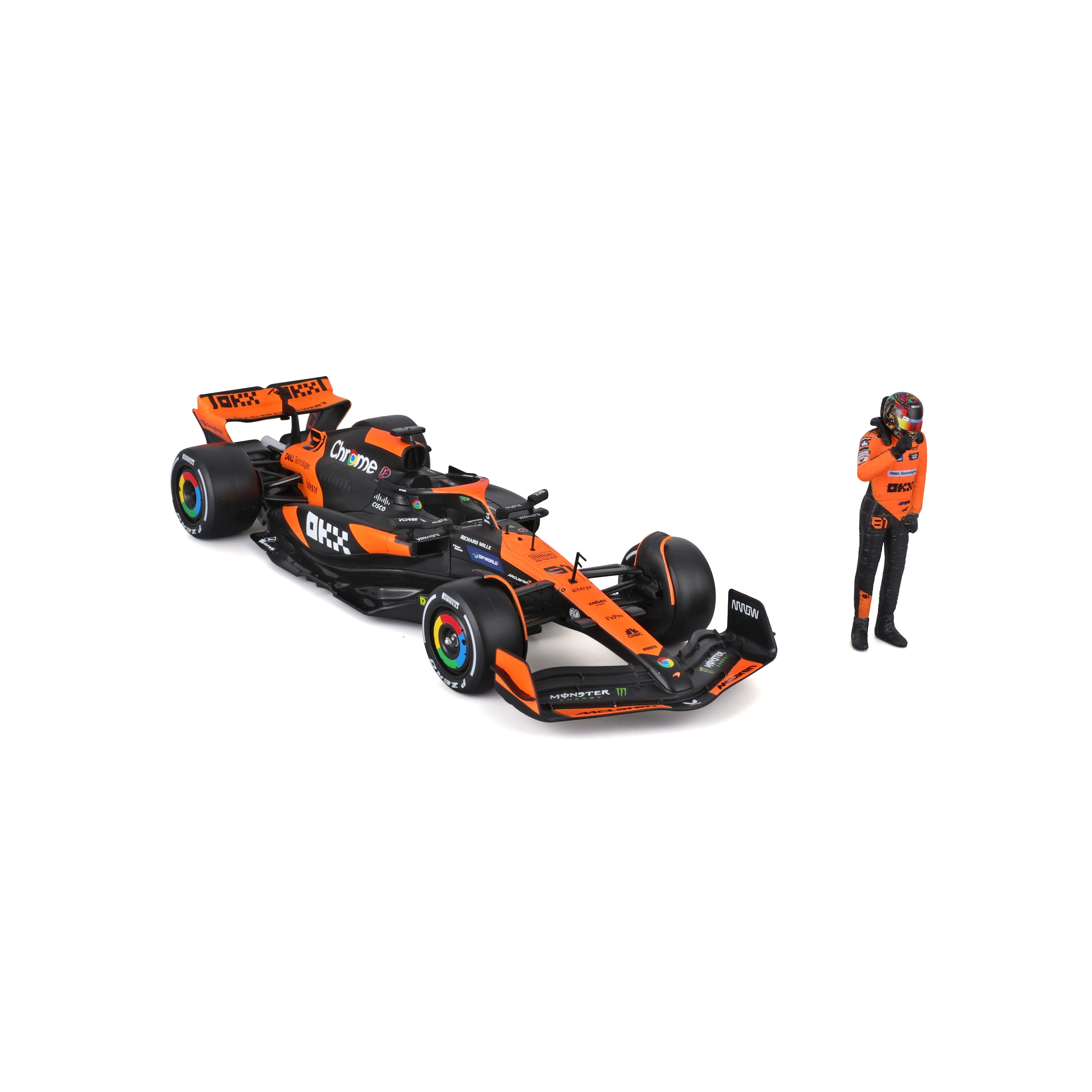 Precise sponsorilogode trükk, oranzi-must värvilahendus ning detailsed tiivad, difuusor ja halo loovad autentse McLaren MCL38 üksikõrra välimuse.