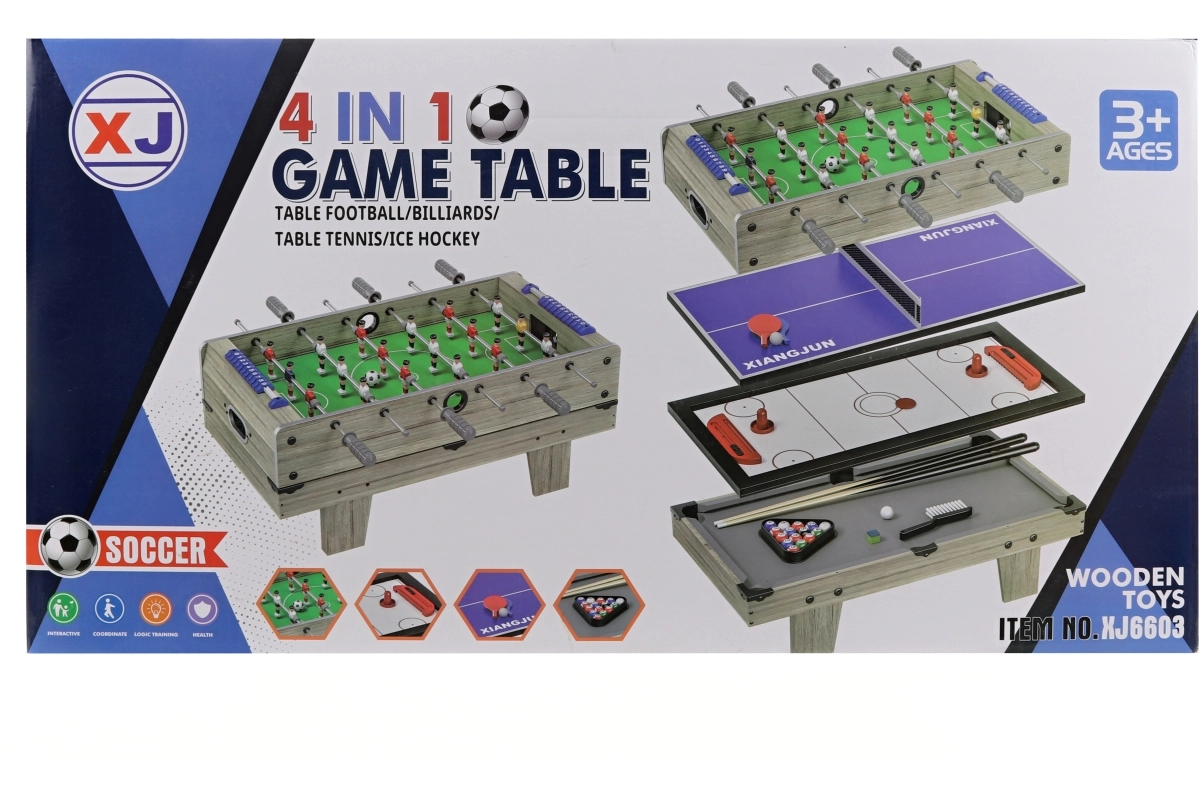 Universaalne 4‑ühes lauamängude komplekt ühendab ühte tugevasse puidust korpusesse jalgpalli, hoki, lauatennise ja kuulimängu. Tänu tugevale alusele ja kergesti vahetatavatele mängulaudadele jagub lõbu tundideks nii lastele kui ka täiskasvanutele. Ideaalne lastetuppa ja pereõhtuteks, sobib alates 3. eluaastast.