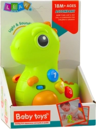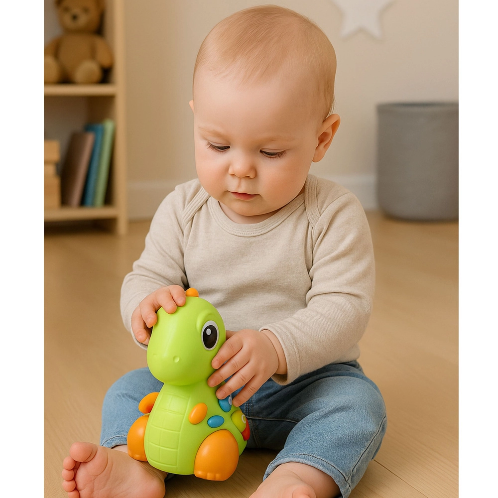 Interaktiivne dinosaurus köidab lapsi juba esimesest pilgust: värviliste nuppude vajutamisel süttivad tuled, kõlavad meloodiad ja lõbusad helid. Õrn toks ninasse käivitab muusika ja liikumise, mis aitab mõista seost puudutuse ja mänguasja reaktsiooni vahel – suurepärane alus õppimiseks läbi mängu.