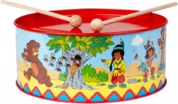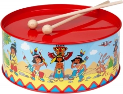 Laste trumm indiaani mustriga, läbimõõt 20 cm, rõõmustab väikseid muusikuid. Valmistatud metallist, täiendatud tekstiili ja kahe puust pulgaga. Kaasas on kaela ümber riputamiseks nöör. Arendab koordinatsiooni, rütmitunnet ja armastust muusika vastu.