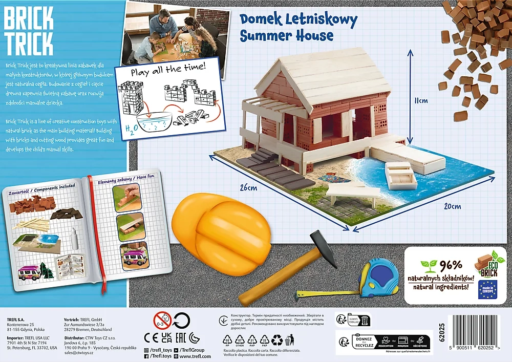 Avasta loov ehitusmaailm originaalse komplektiga Trefl Brick Trick suveresidents M. Päris savisetest tellistest ja puidust liistudest ehitad maja samm-sammult ning tänu vees lahustuvale liimile saad ehitada ikka ja jälle. Komplekt arendab käsioskusi, fantaasiat ja keskendumisvõimet – ideaalne lõbu nii väikestele kui ka suurtele ehitajatele.