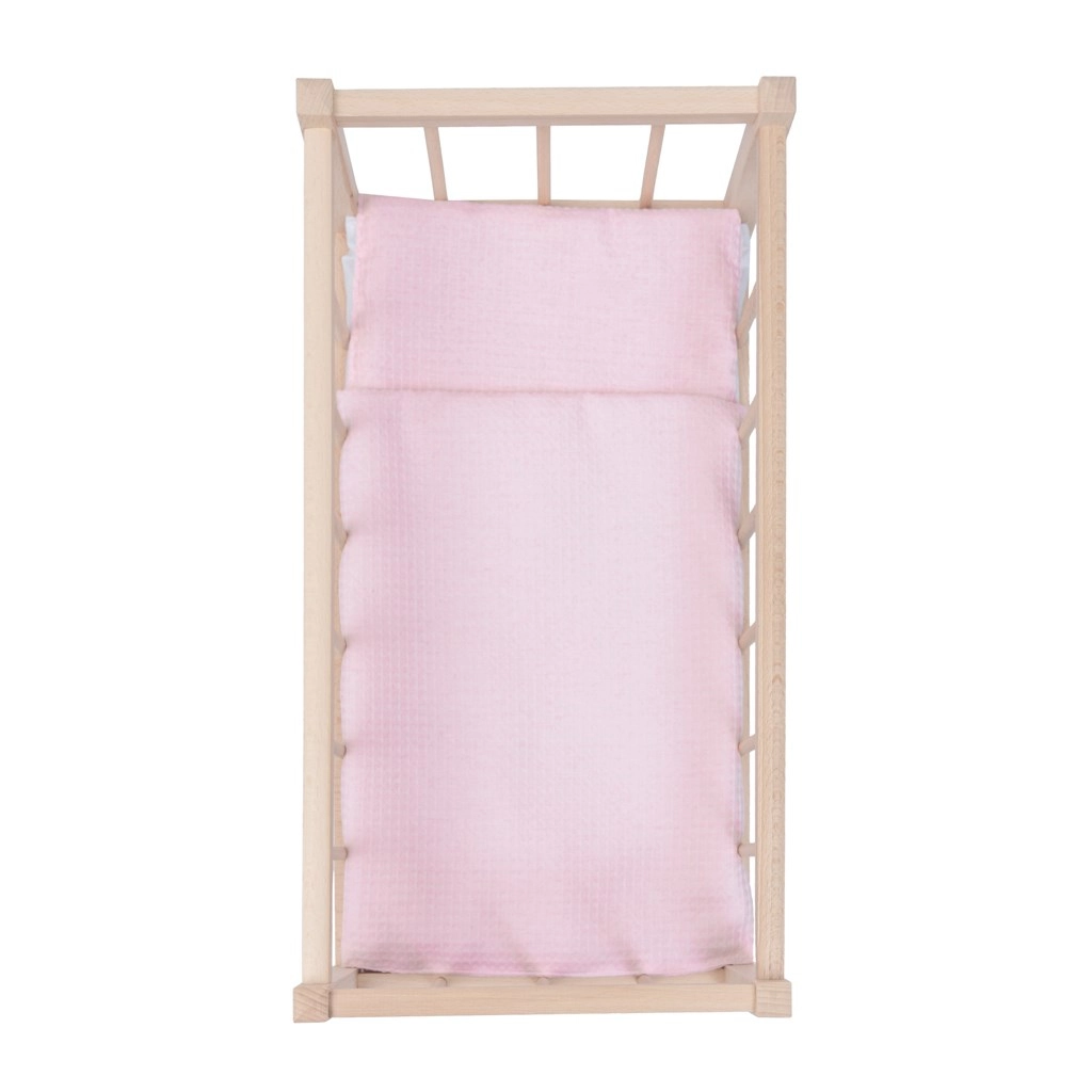 Komplekti kuuluvad madrats, padi ja tekk mahedas roosas toonis – pehmed, meeldivad puudutusele ja ilusasti omavahel kooskõlas.